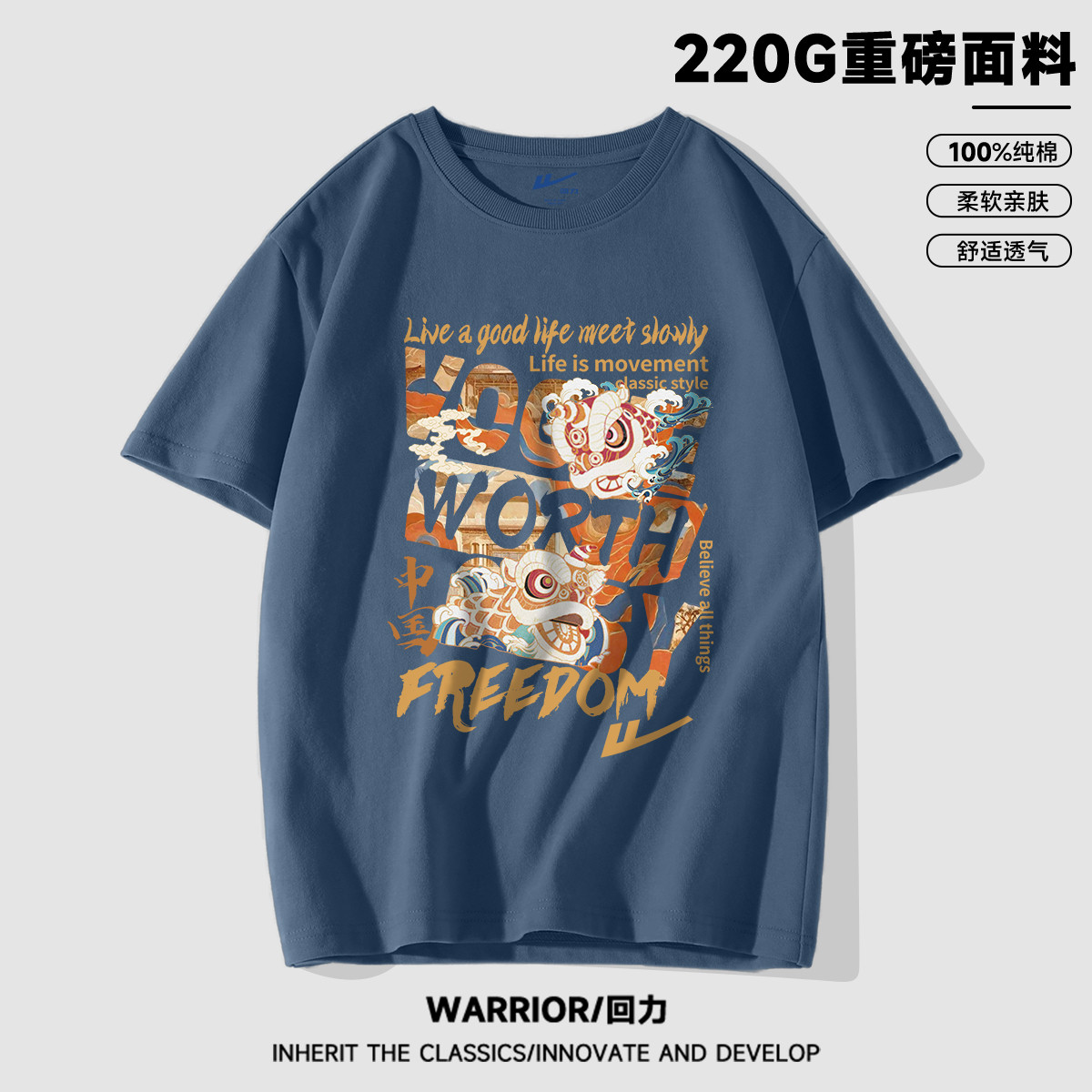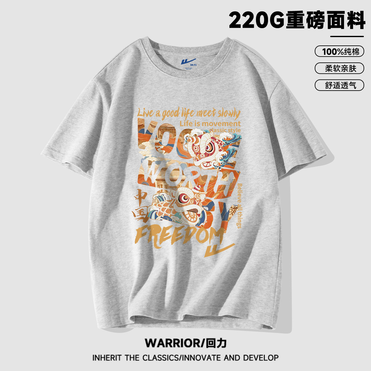 【100%纯棉】国潮复古风夏季宽松潮牌高街帅气男生短袖t恤衫 002899