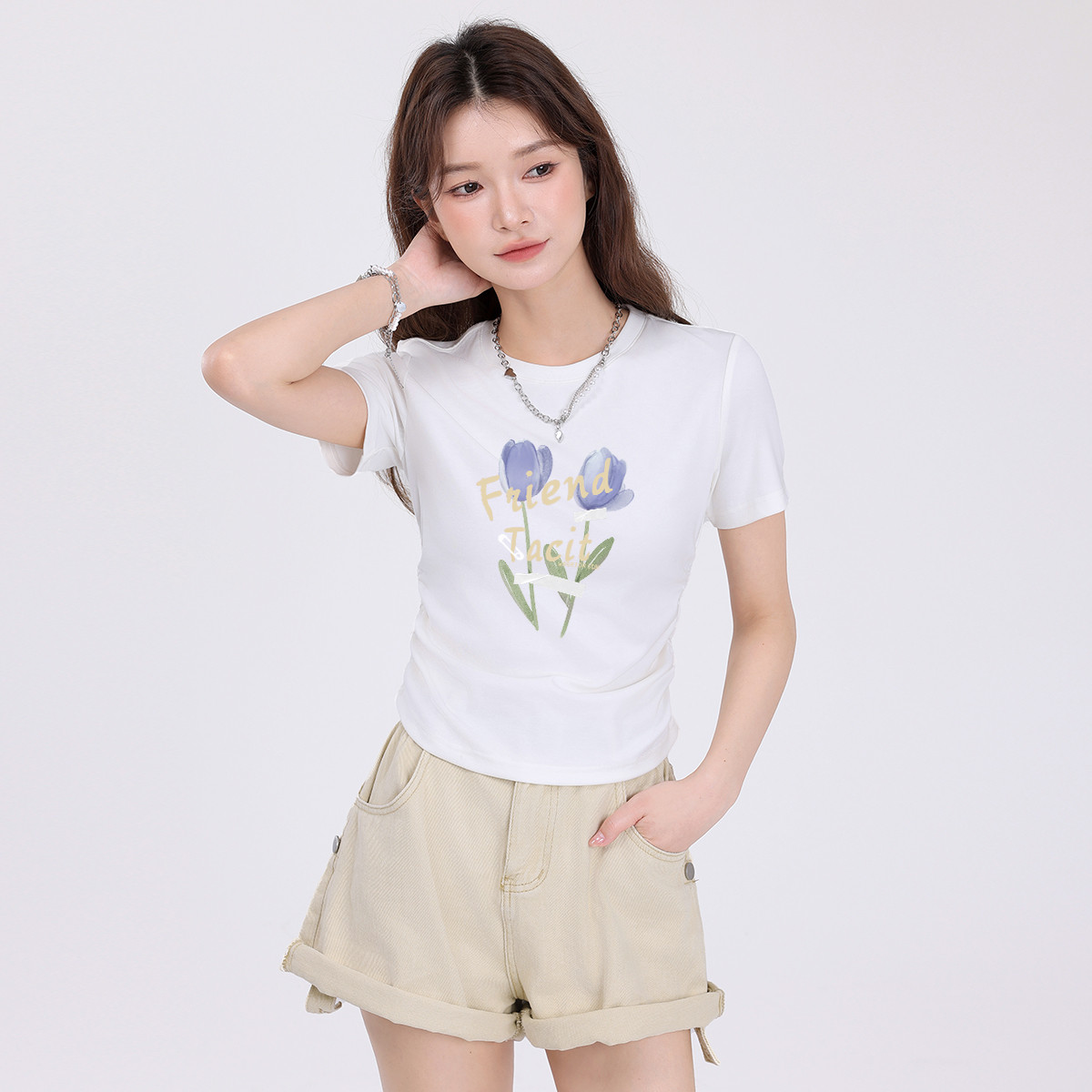 【女装正肩】女式短款小个子T恤紧身显瘦夏季小众抽褶设计感短袖 237395