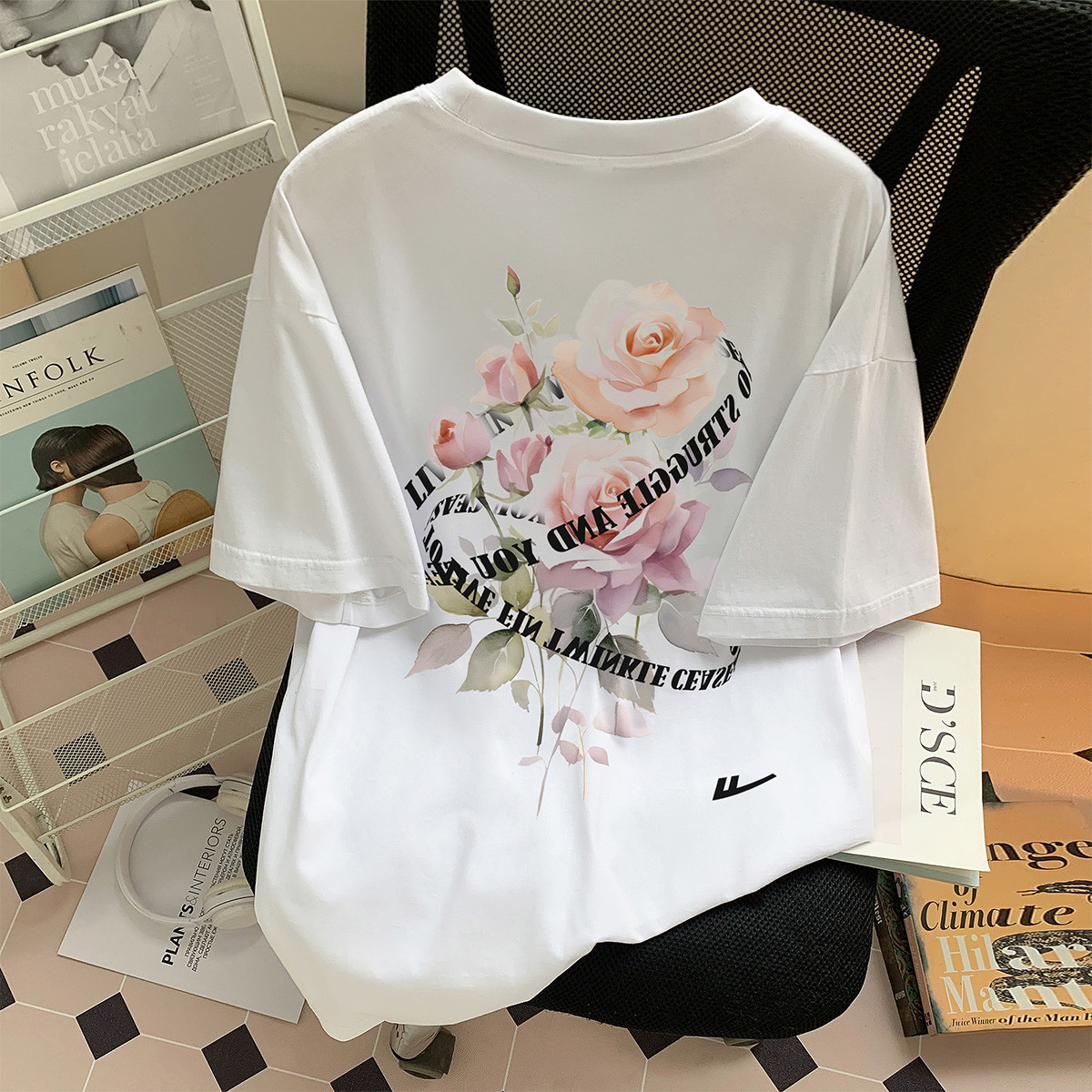 【100%棉】情侣纯棉玫瑰印花T恤女短袖ins慵懒风宽松半袖 459411