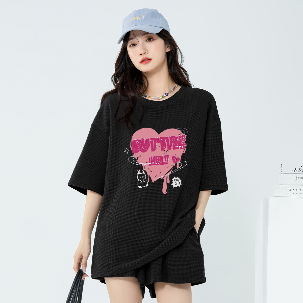 【女装】半袖女式T恤夏季宽松华夫格中长短袖上衣女潮 483923