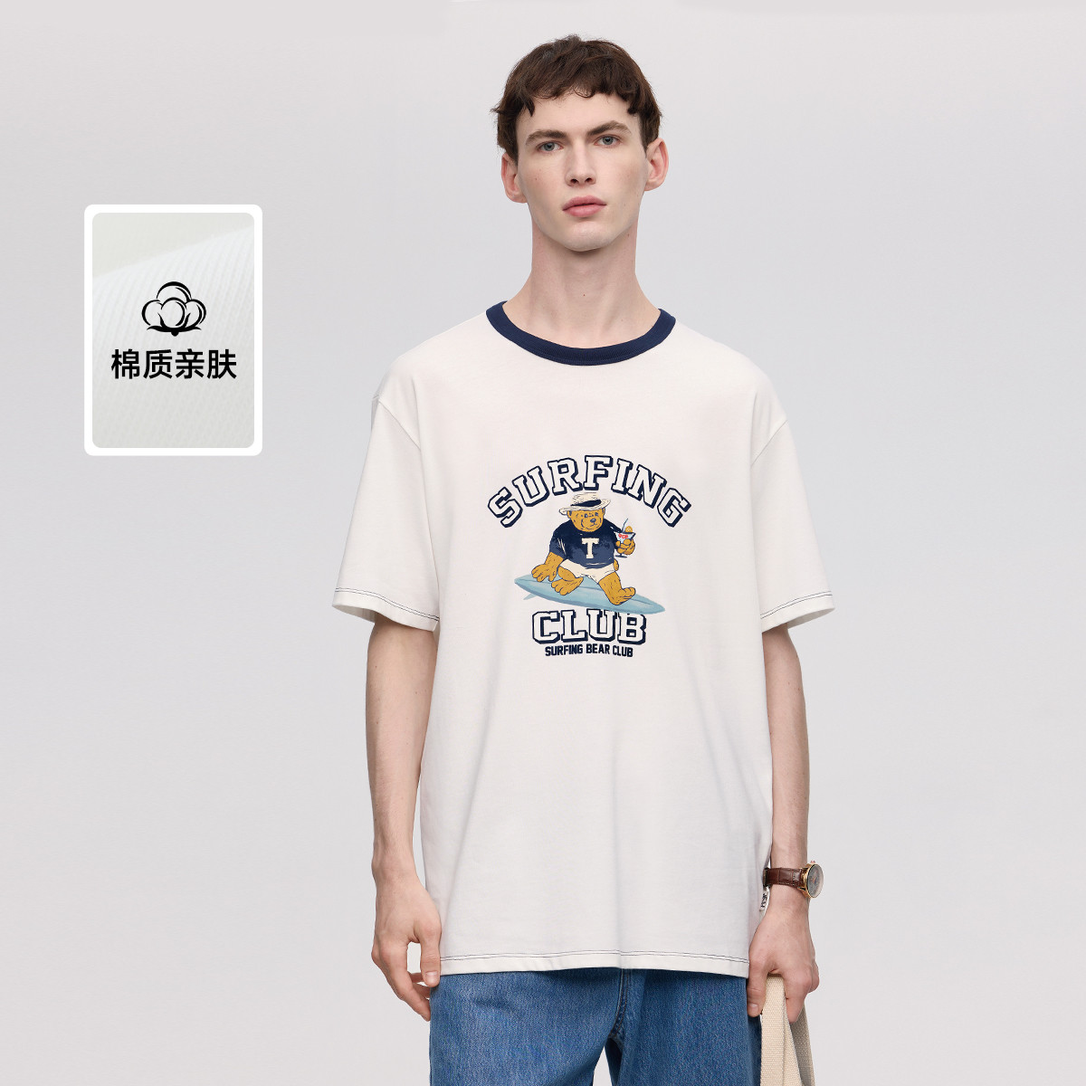 小熊男装简约时尚潮流白色T恤夏季学院撞色圆领休闲男士t恤短袖 504577