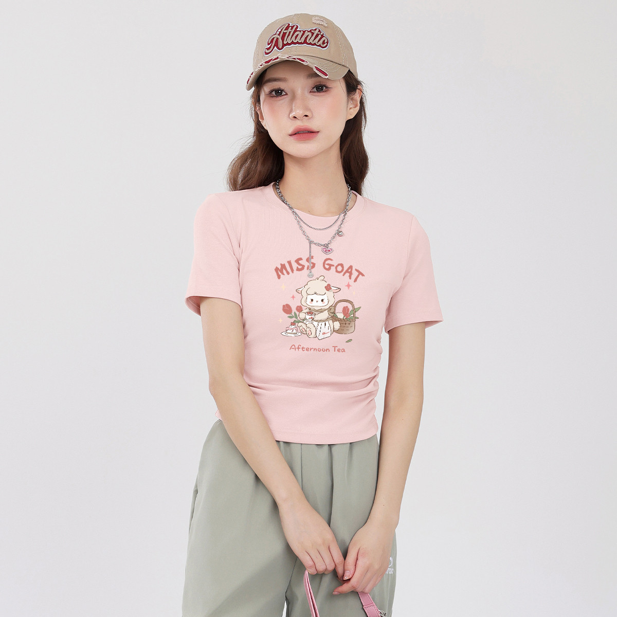 【女装正肩】女式短款小个子T恤紧身显瘦夏季小众抽褶设计感短袖 114515