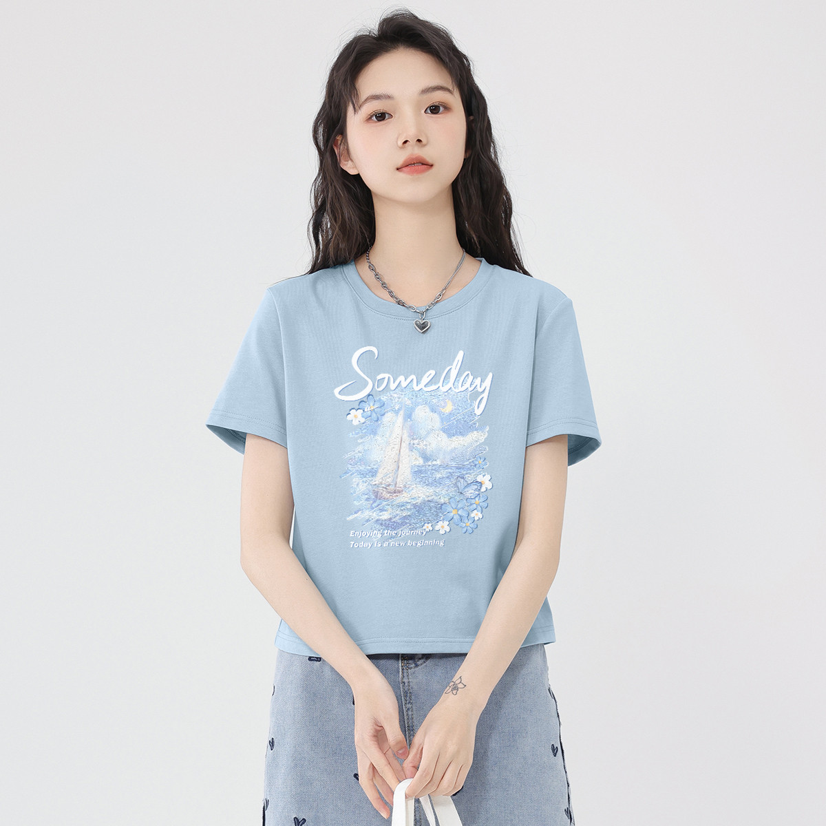 【女装100%棉】夏季女式短袖休闲短款显瘦正肩设计感T恤 643347