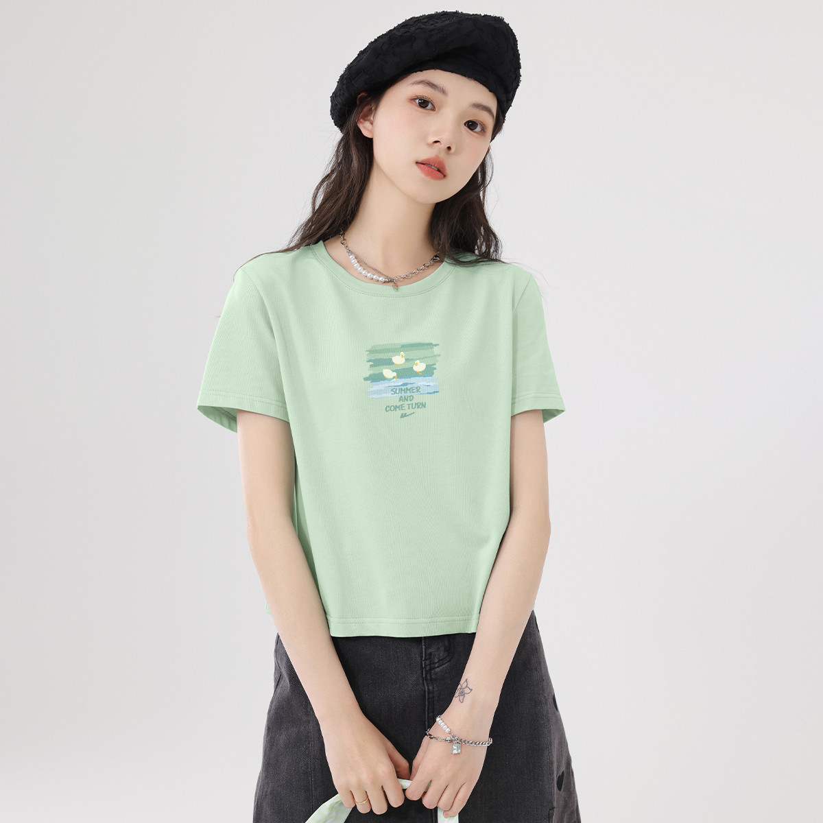【女装100%棉】正肩短袖T恤女夏设计感显高辣妹露脐短款上衣 423571