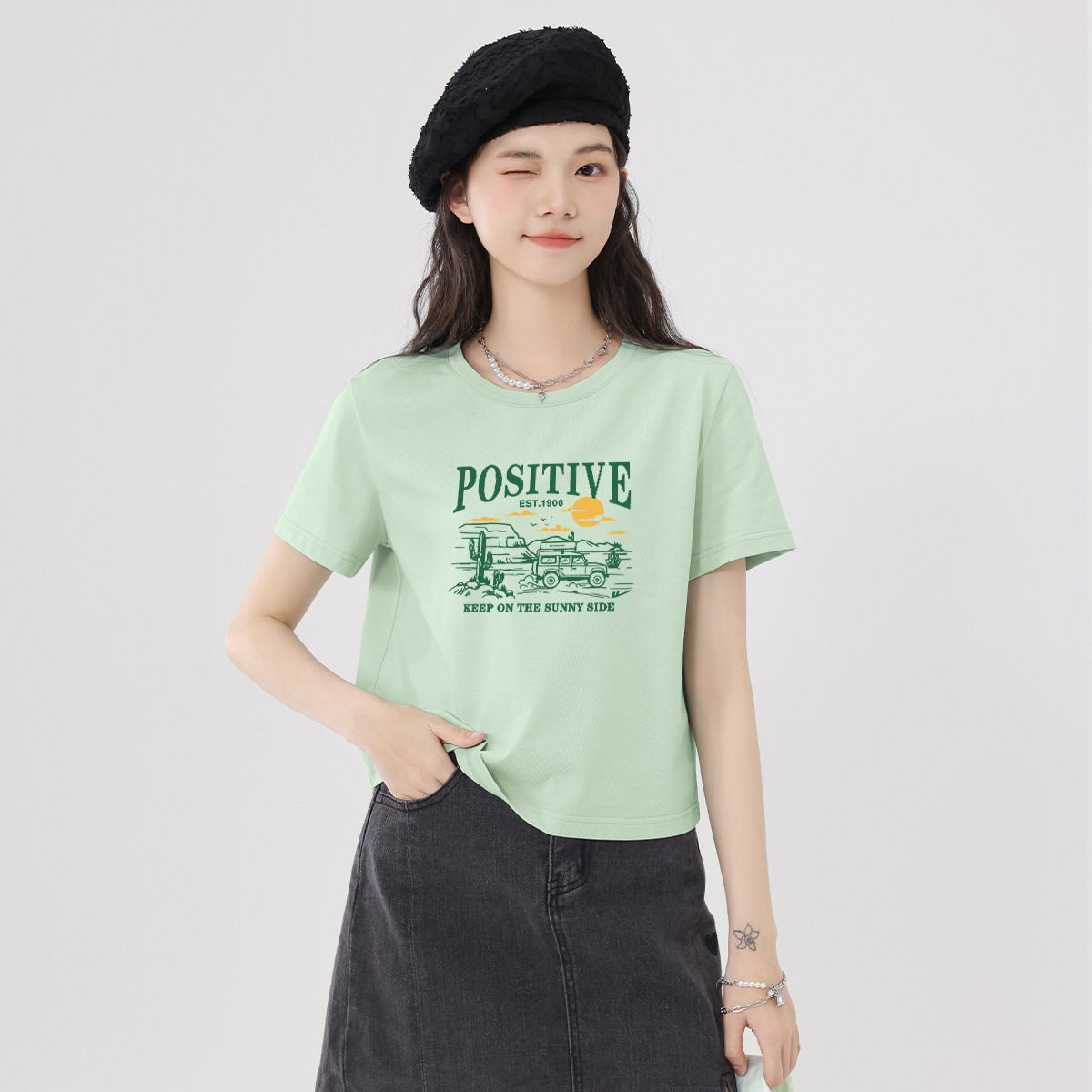 【女装100%棉】夏季女式短袖上衣休闲短款显瘦正肩设计感T恤 317075