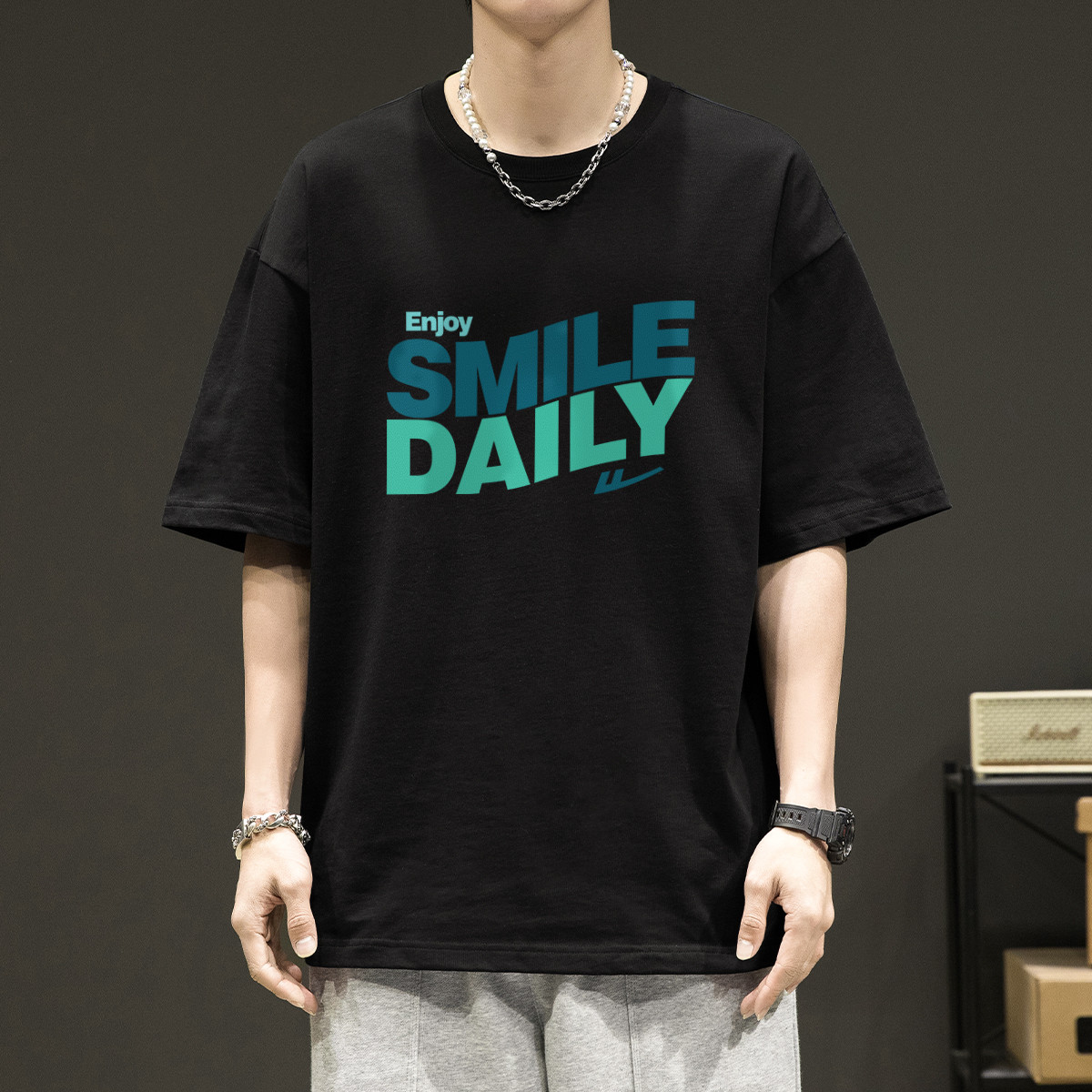 T恤男宽松纯棉五分袖盐系男友风潮流半袖简约短袖男舒适运动上衣 265363