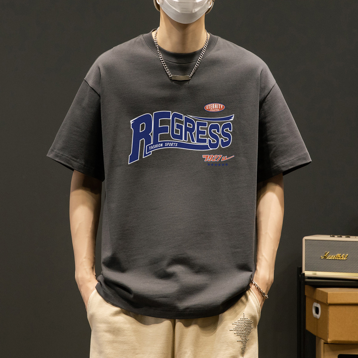 【100%纯棉】国潮复古风夏季宽松潮牌高街帅气男生短袖t恤衫 457555