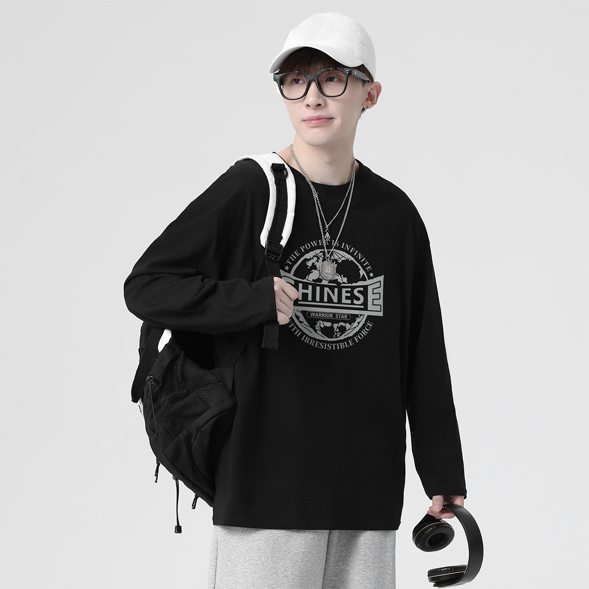 【潮流T恤】春季男式T恤个性潮流印花宽松圆领纯棉长袖T恤男 241107