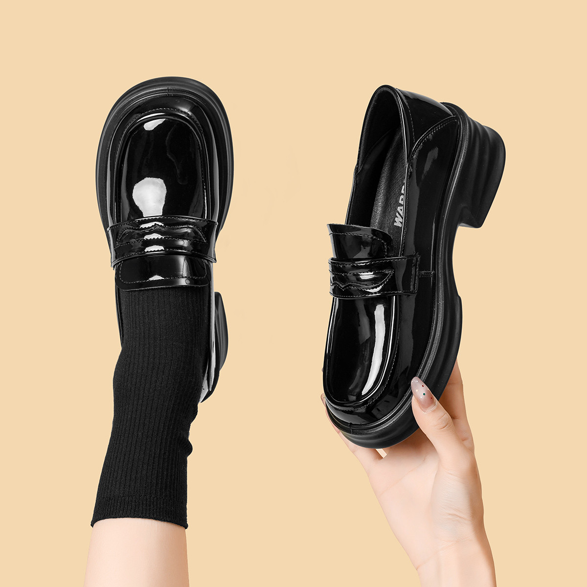 黑色法式厚底乐福鞋女一脚蹬单鞋增高复古风英伦松糕厚底小皮鞋 668624