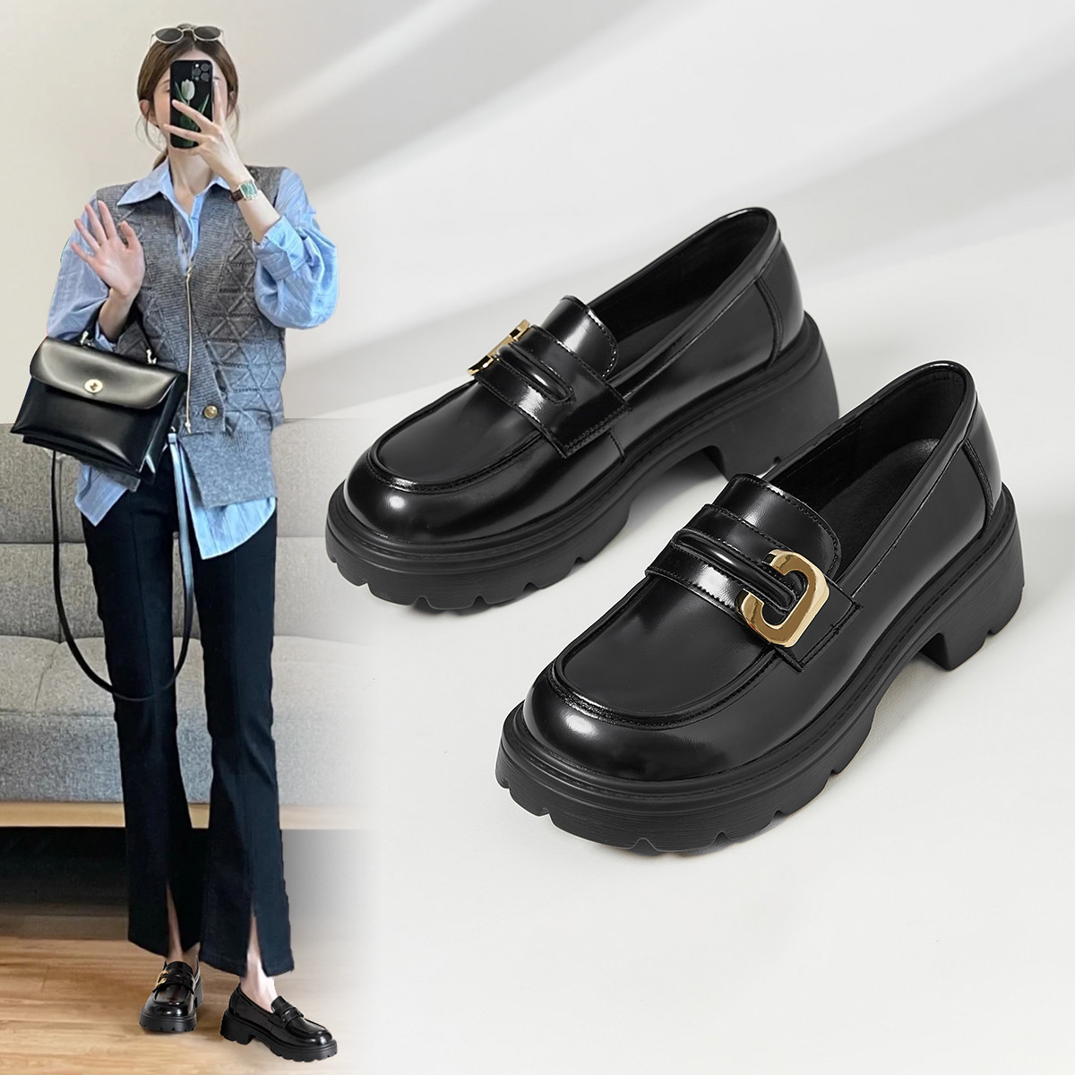 【秒高5.5】英伦风牛剖层革单鞋女小皮鞋百搭厚底乐福鞋子女鞋 338560