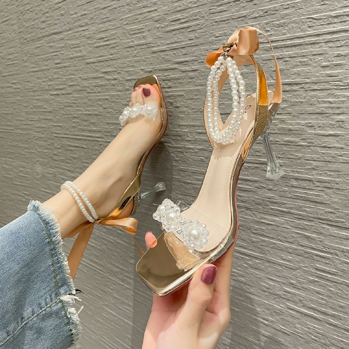 夏季气质高跟鞋女一字带凉鞋珍珠饰扣女外穿凉拖鞋时尚百搭通勤鞋 720343