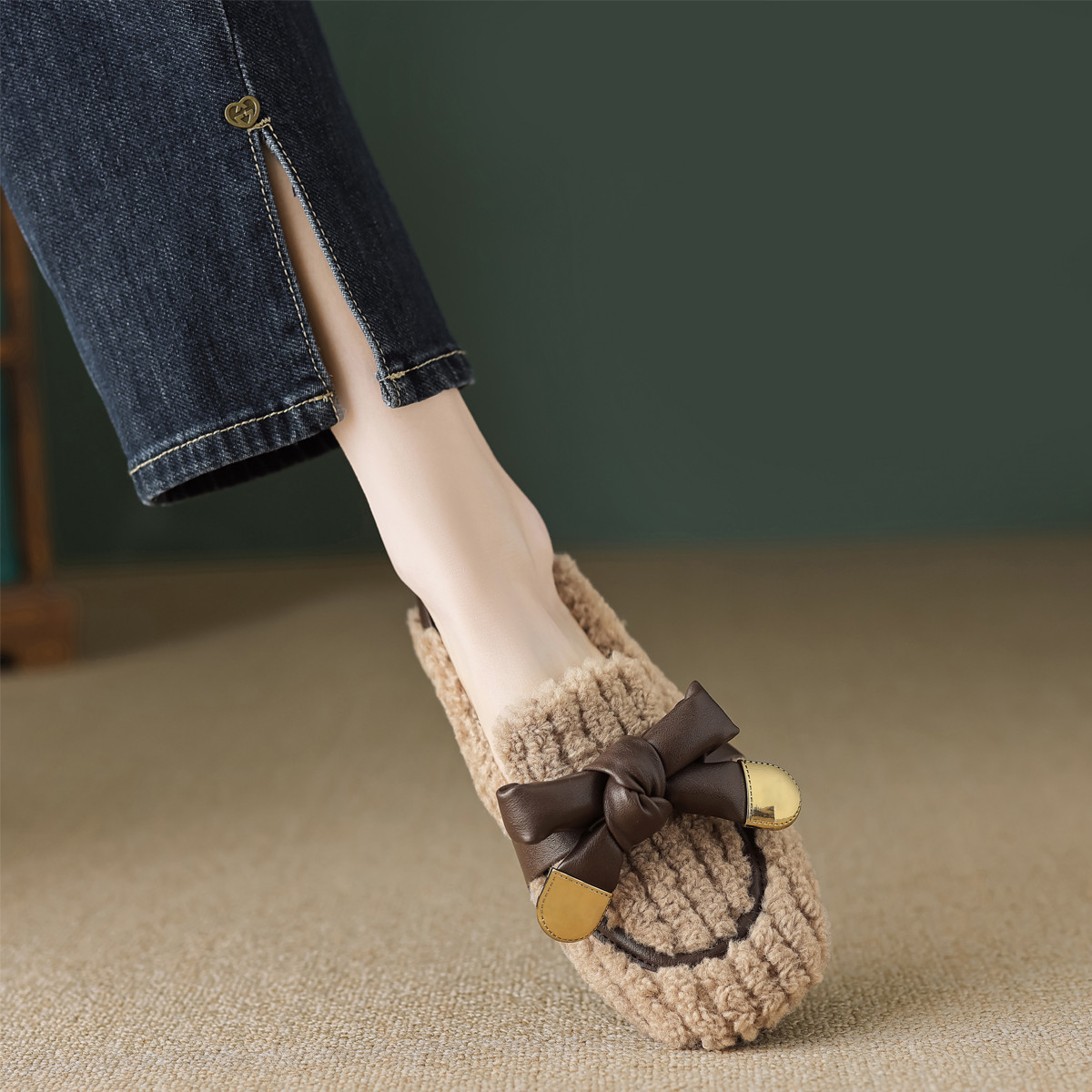 春美拉德色系毛毛鞋女外穿棉单鞋时尚蝴蝶结平底鞋 065793