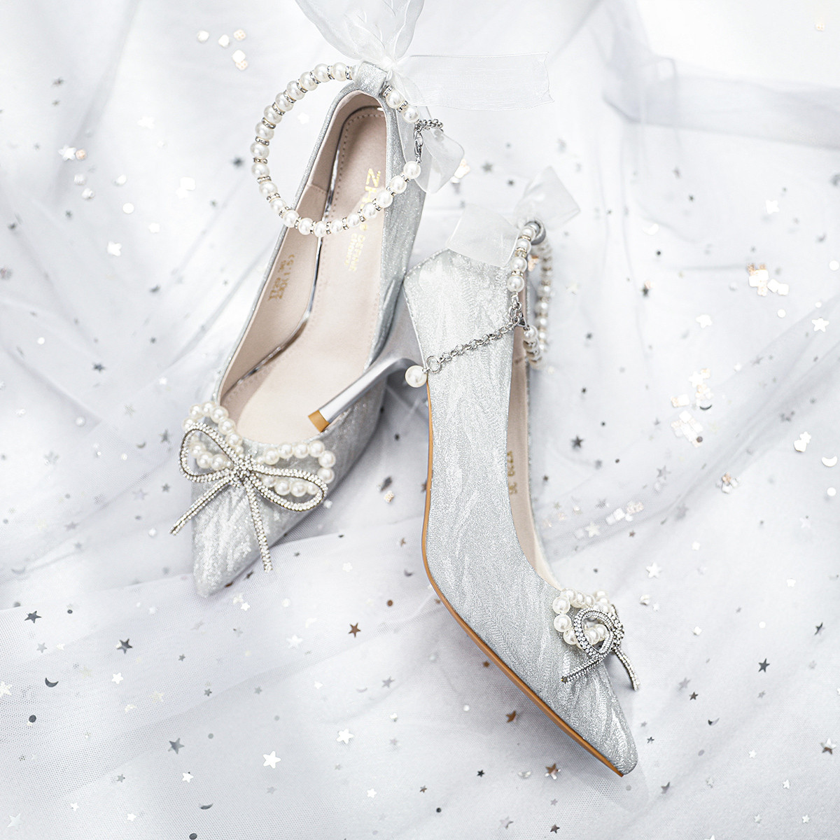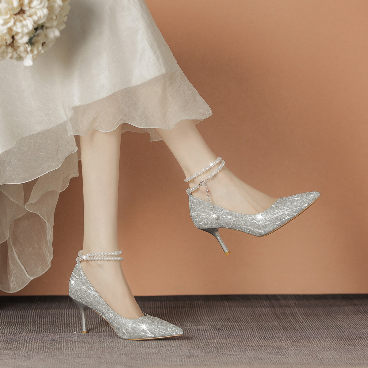【珍珠链条】闪闪细跟单鞋伴娘鞋尖头婚鞋一脚蹬女鞋高跟鞋女单鞋 889984