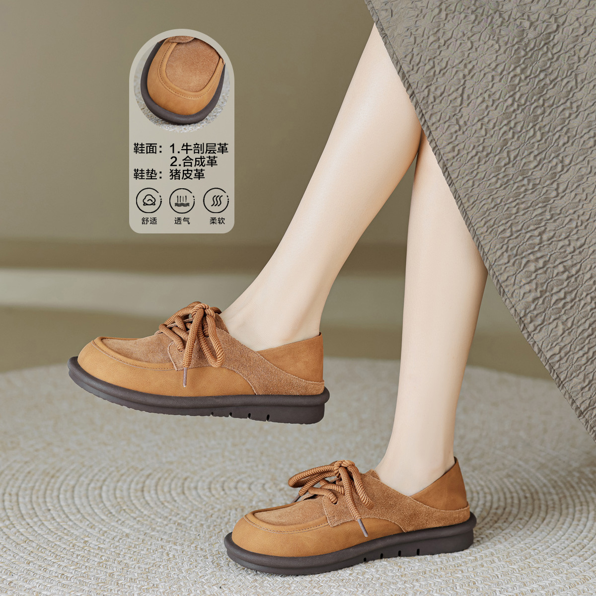 春潮流百搭美拉德风复古绒面材质拼接粗圆鞋带女鞋 355393