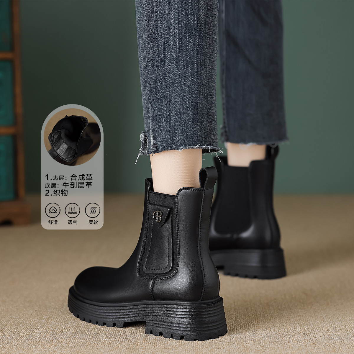 春复古百搭潮拼接圆头撞色侧边口袋装饰切尔西靴靴 060289