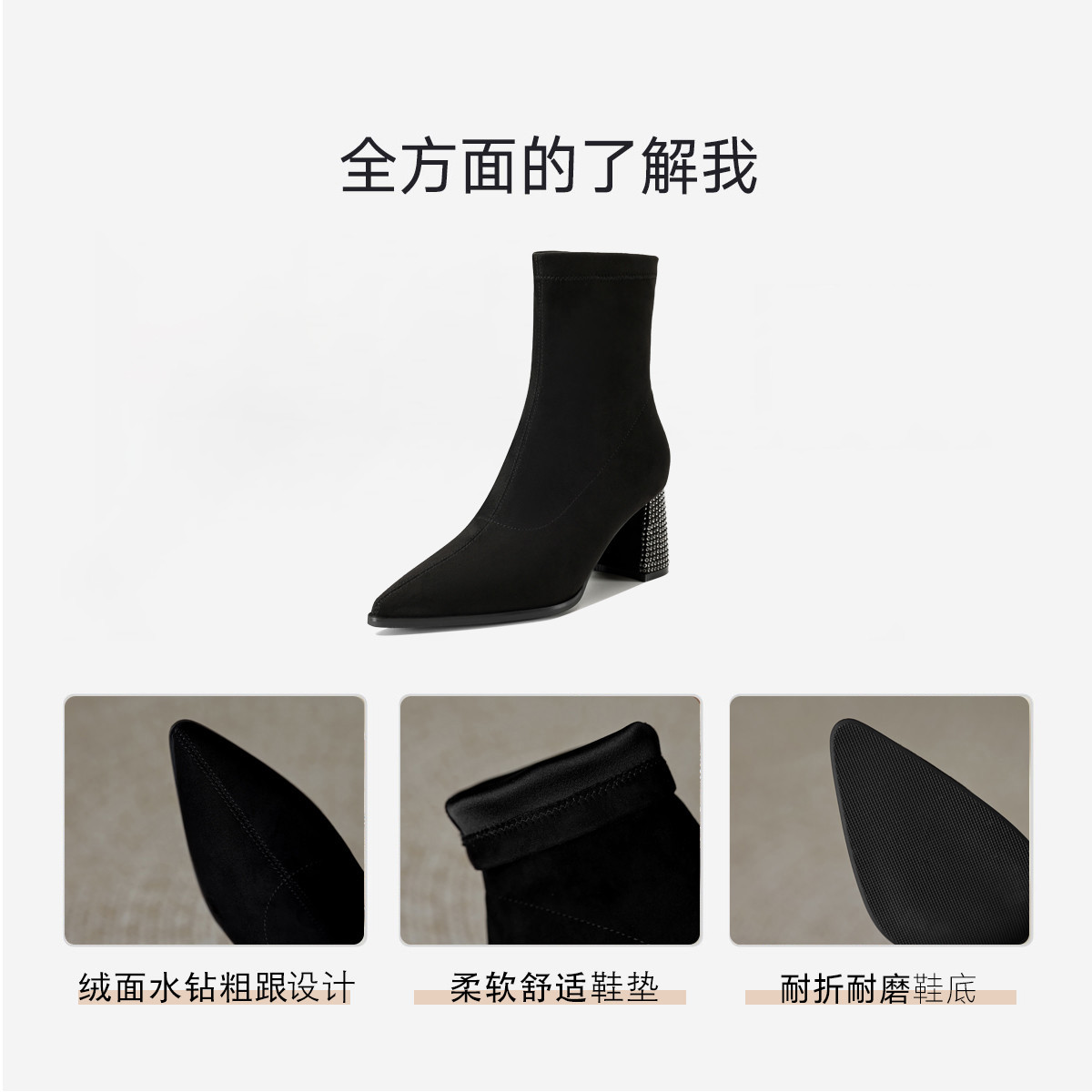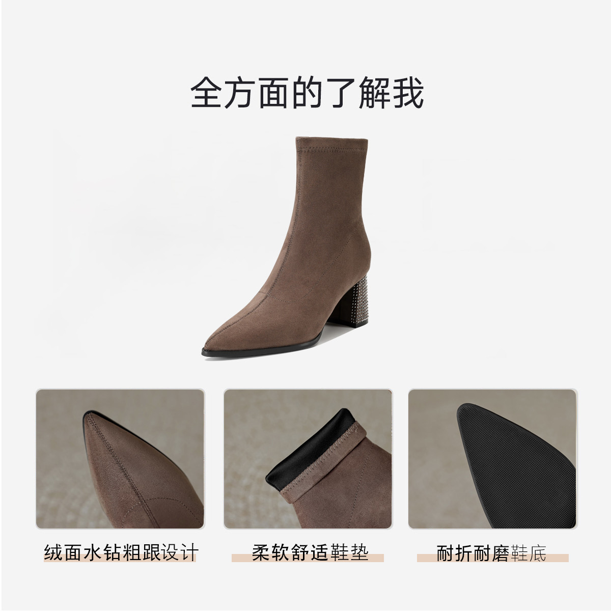 春美拉德色系通勤百搭日常绒面水钻粗跟尖头女靴弹力靴 188865