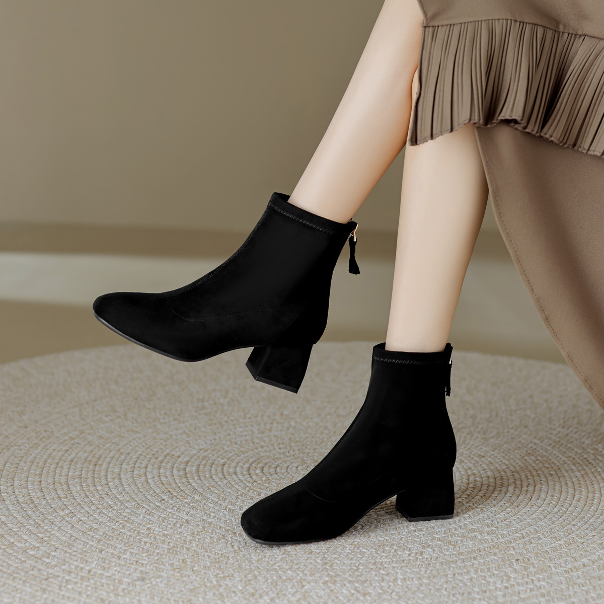 春百搭通勤简约纯色后拉链绒面圆头女靴时装靴 875777