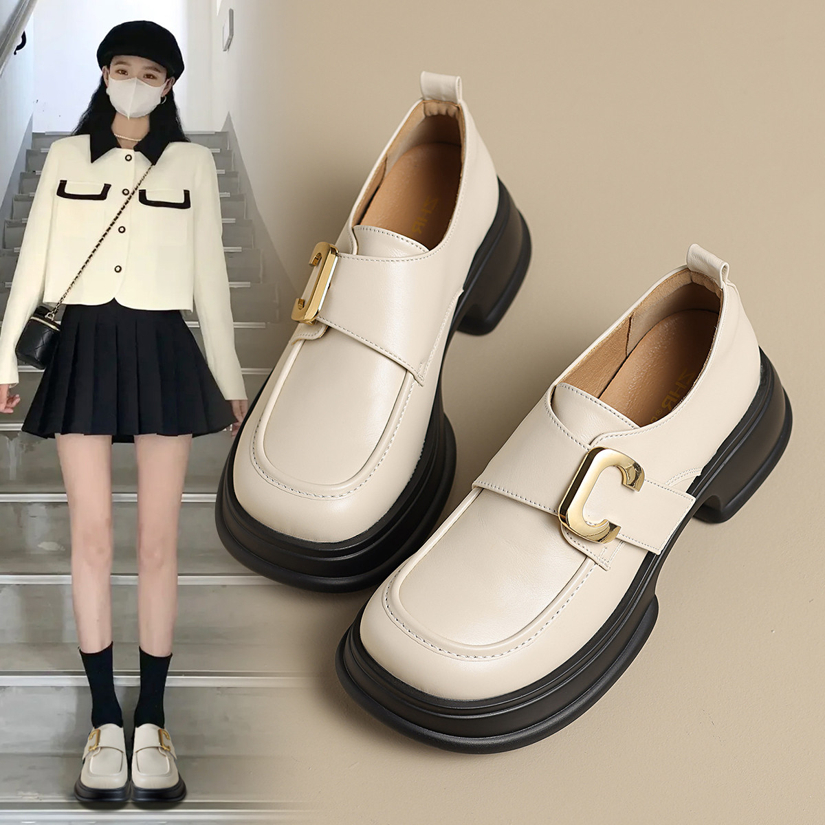 【C形字母+魔术贴】时尚小皮鞋子女士单鞋春秋厚底乐福鞋女单鞋 896320