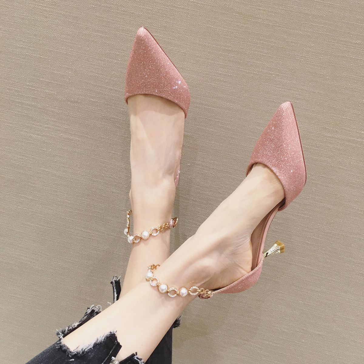夏季女单鞋一字带凉鞋法式小香风高跟鞋时尚通勤鞋中空凉拖时装鞋 632919