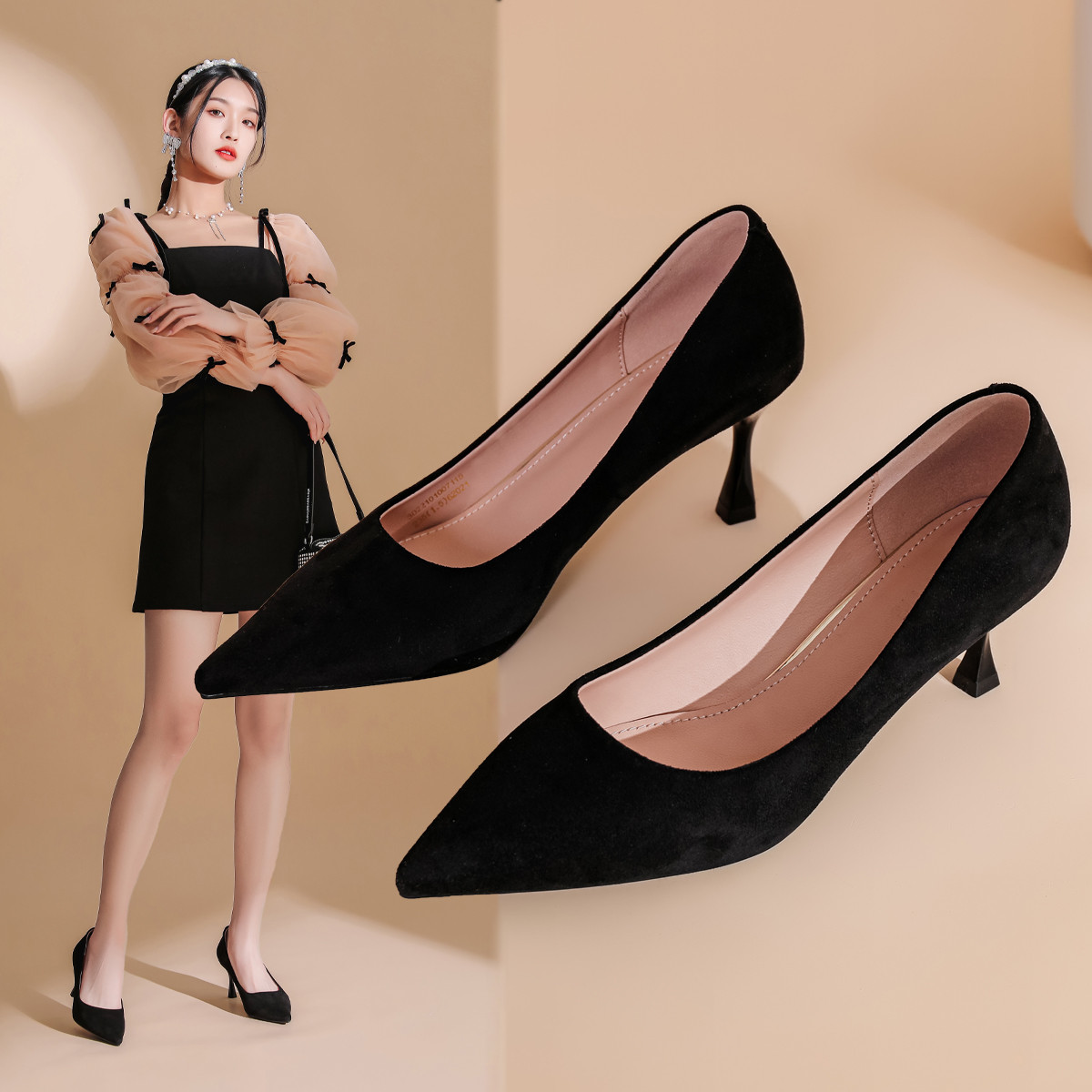 高跟鞋女春秋黑色绒面女鞋浅口单鞋通勤职业正装 438042