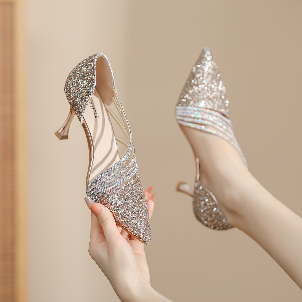 侧空主婚纱单鞋2025新款新娘水晶配晚礼服细跟婚鞋尖头高跟鞋 829591