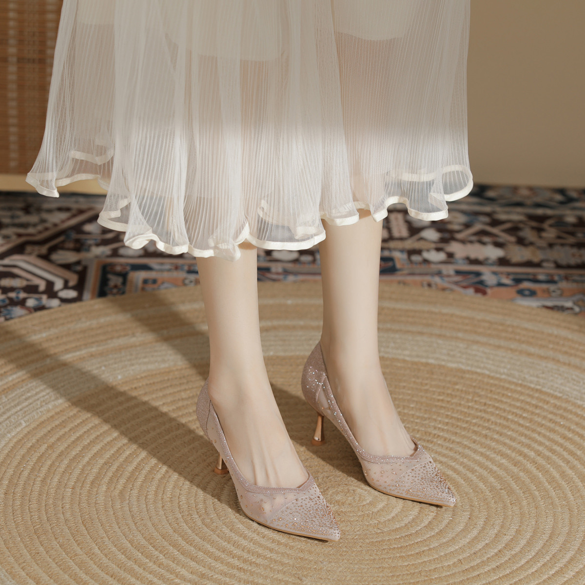 细跟高跟鞋女2025新款春夏网纱透气仙女风配裙水钻尖头单鞋女 388119