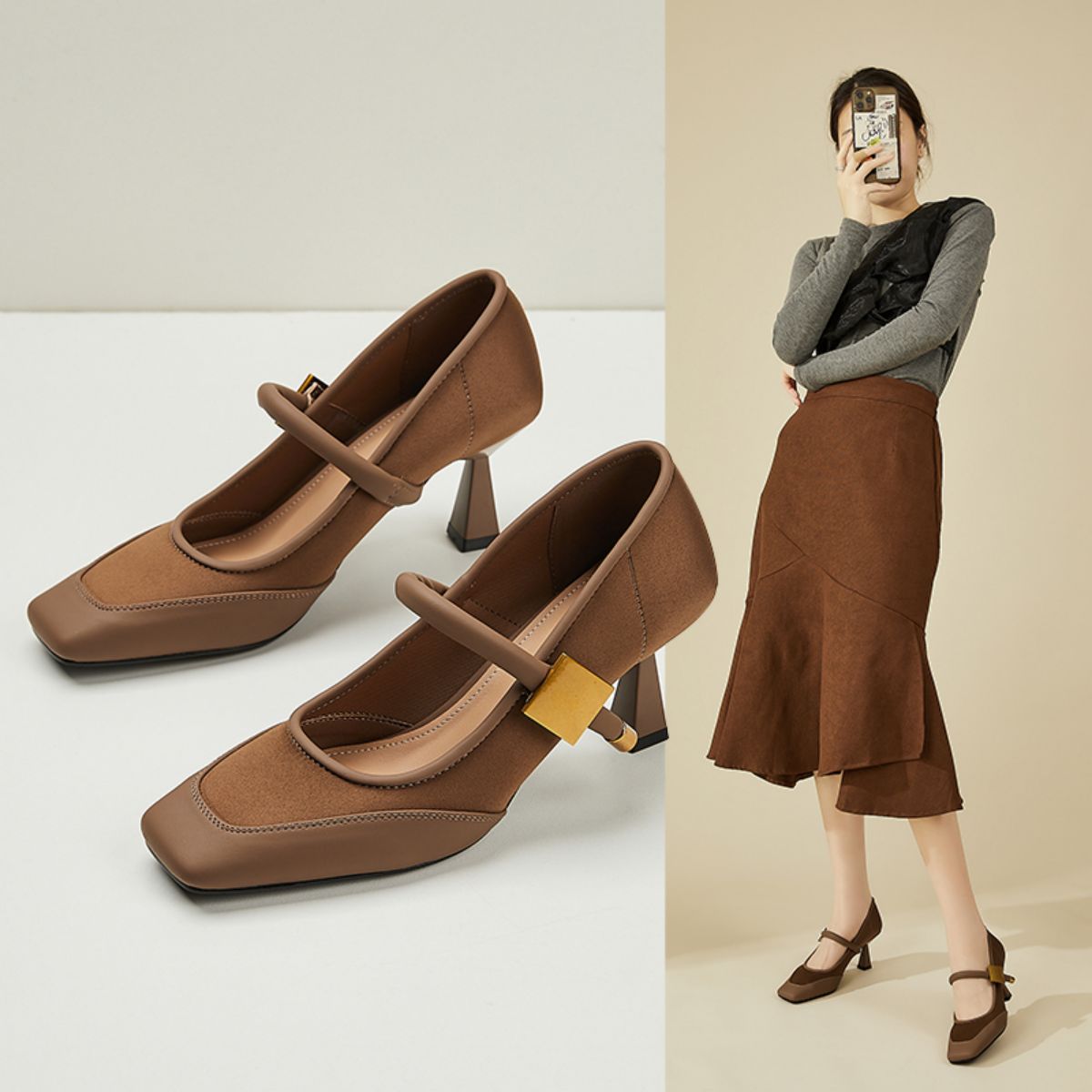 【法式气质】25透气玛丽珍鞋女金属扣一字带方头细跟浅口高跟鞋 989399