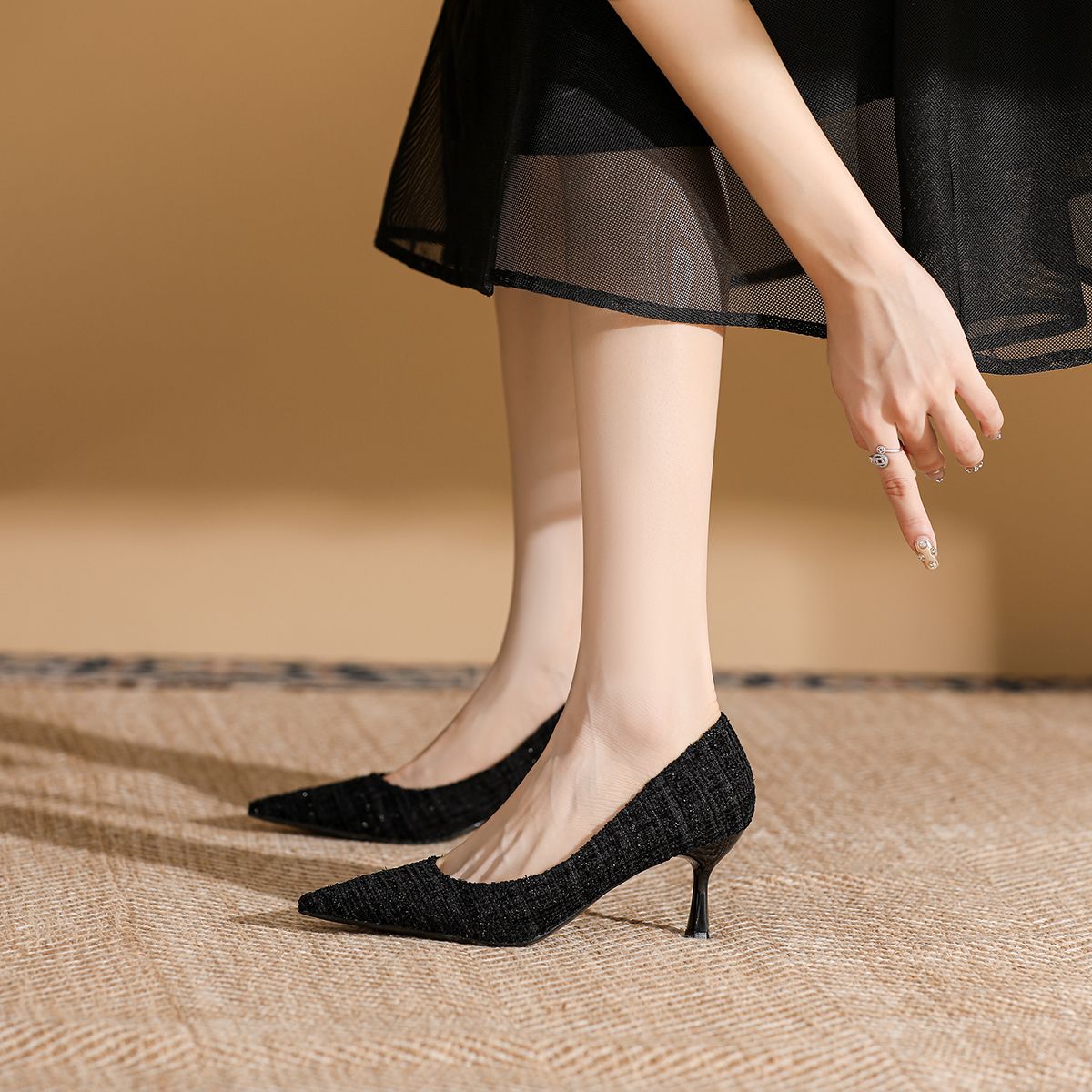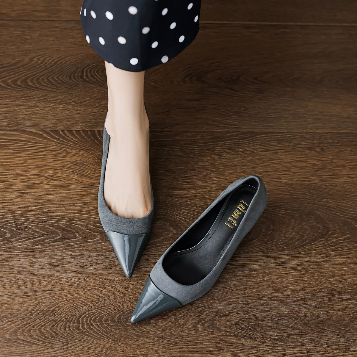 2024秋季简约百搭气质高级感绒面拼接温柔淑女尖头细跟女单鞋 329409