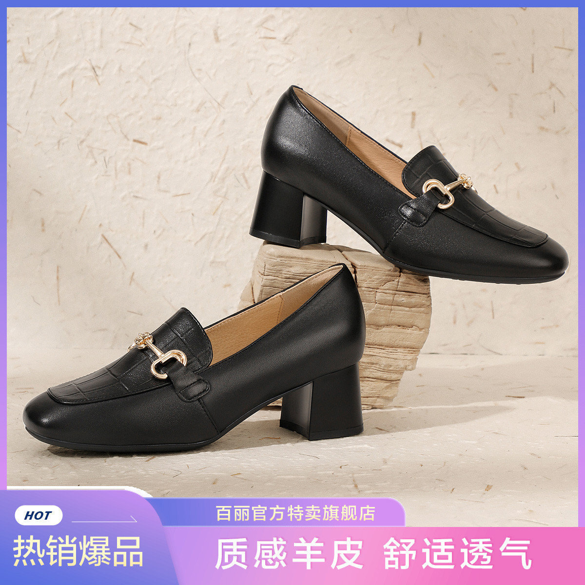 【尖货推荐】百丽舒适乐福鞋女春季羊皮革简约百搭通勤高跟单鞋 464474