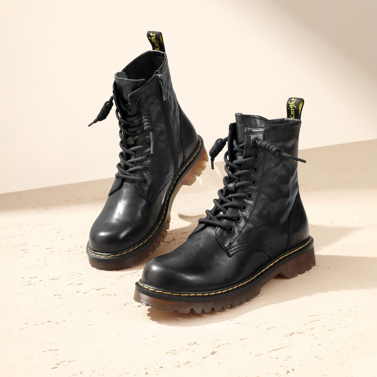 百丽女靴子黑色马丁靴复古女靴英伦风短靴软弹鞋底 985882