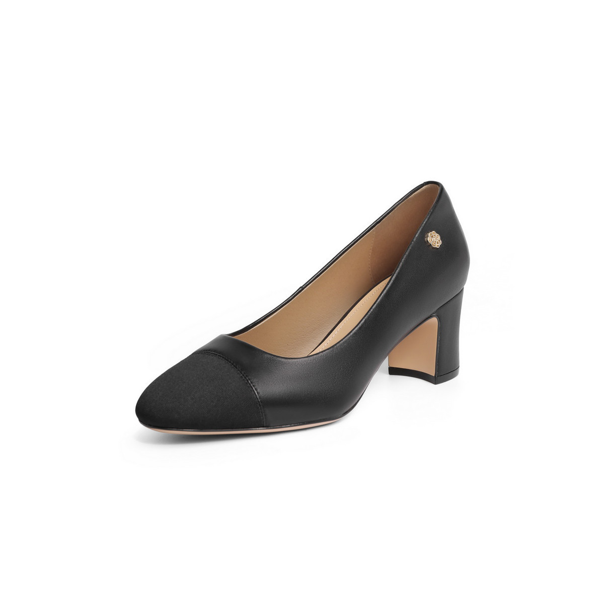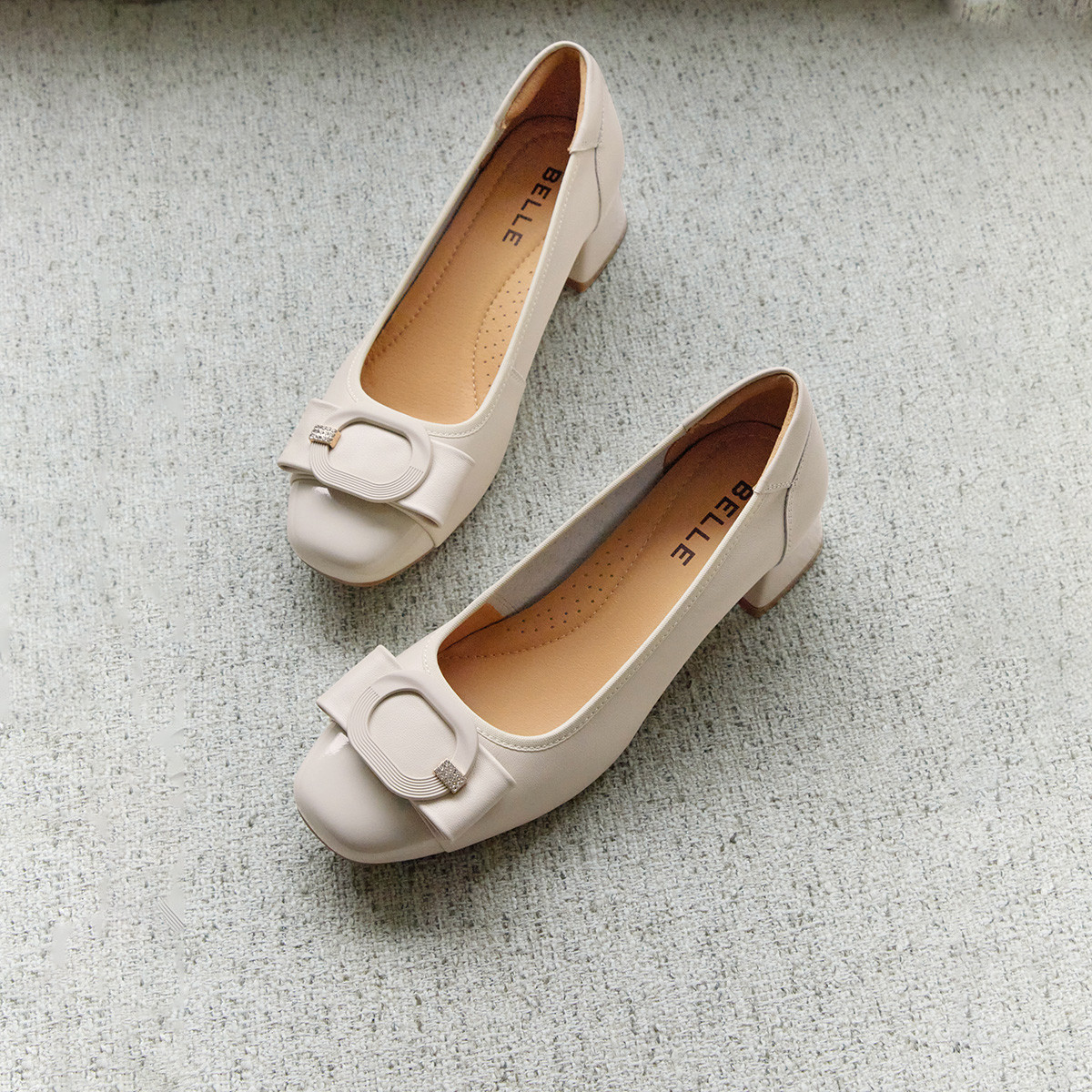 百丽女鞋真皮妈妈鞋法式粗高跟鞋上班穿不累脚单鞋 366810