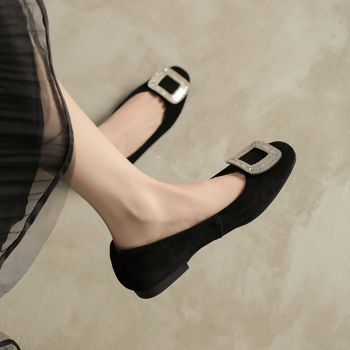 羊绒平底单鞋女四季款浅口平底鞋女水钻黑色通勤职业女鞋 042074
