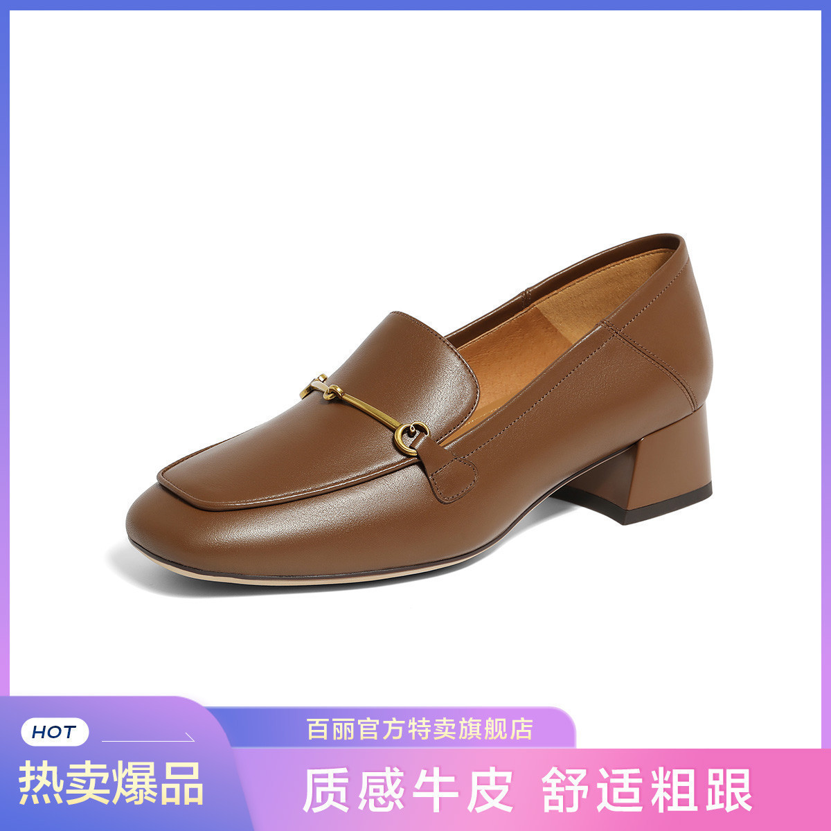 百丽女鞋子92系列真皮一脚蹬乐福鞋上班穿不累脚粗跟单鞋 031770