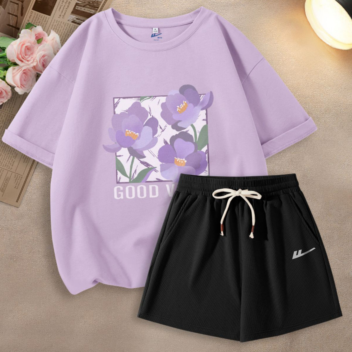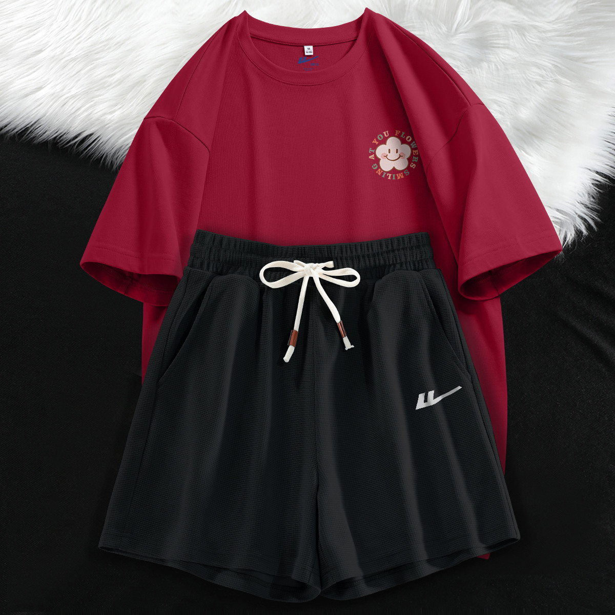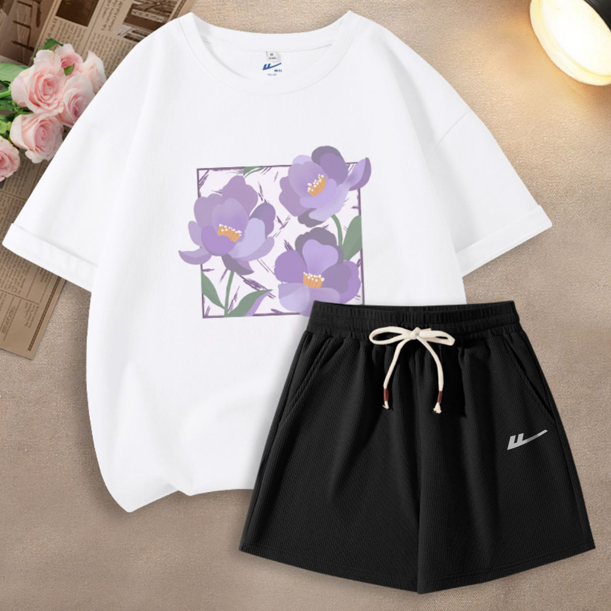 【女装】夏季女式运动套装华夫格三分短裤+宽松T两件套 384403
