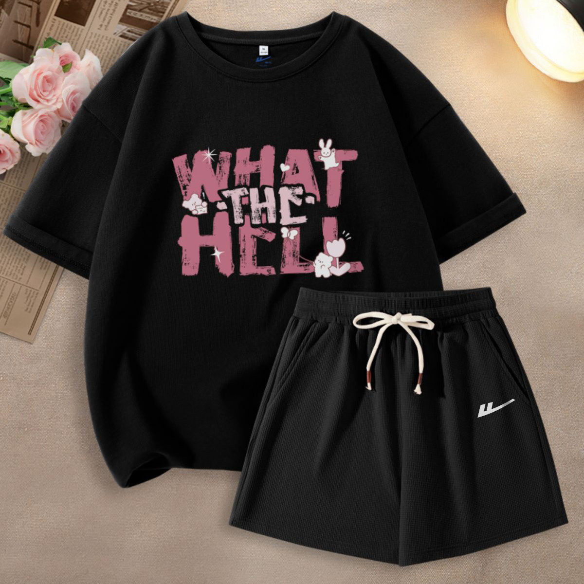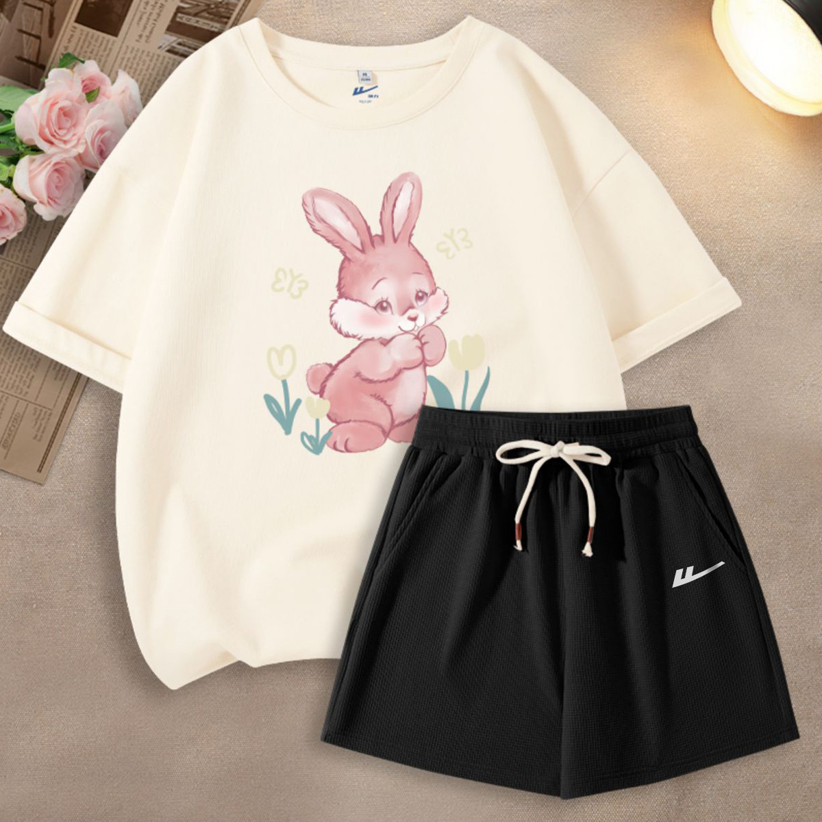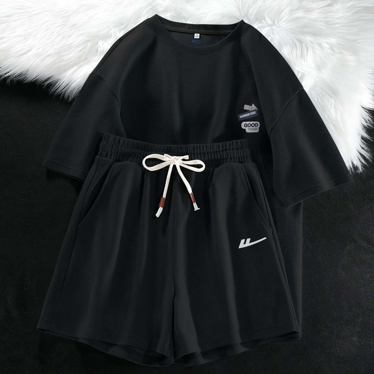 【女装】夏季女式运动套装华夫格三分短裤+宽松T两件套 384403
