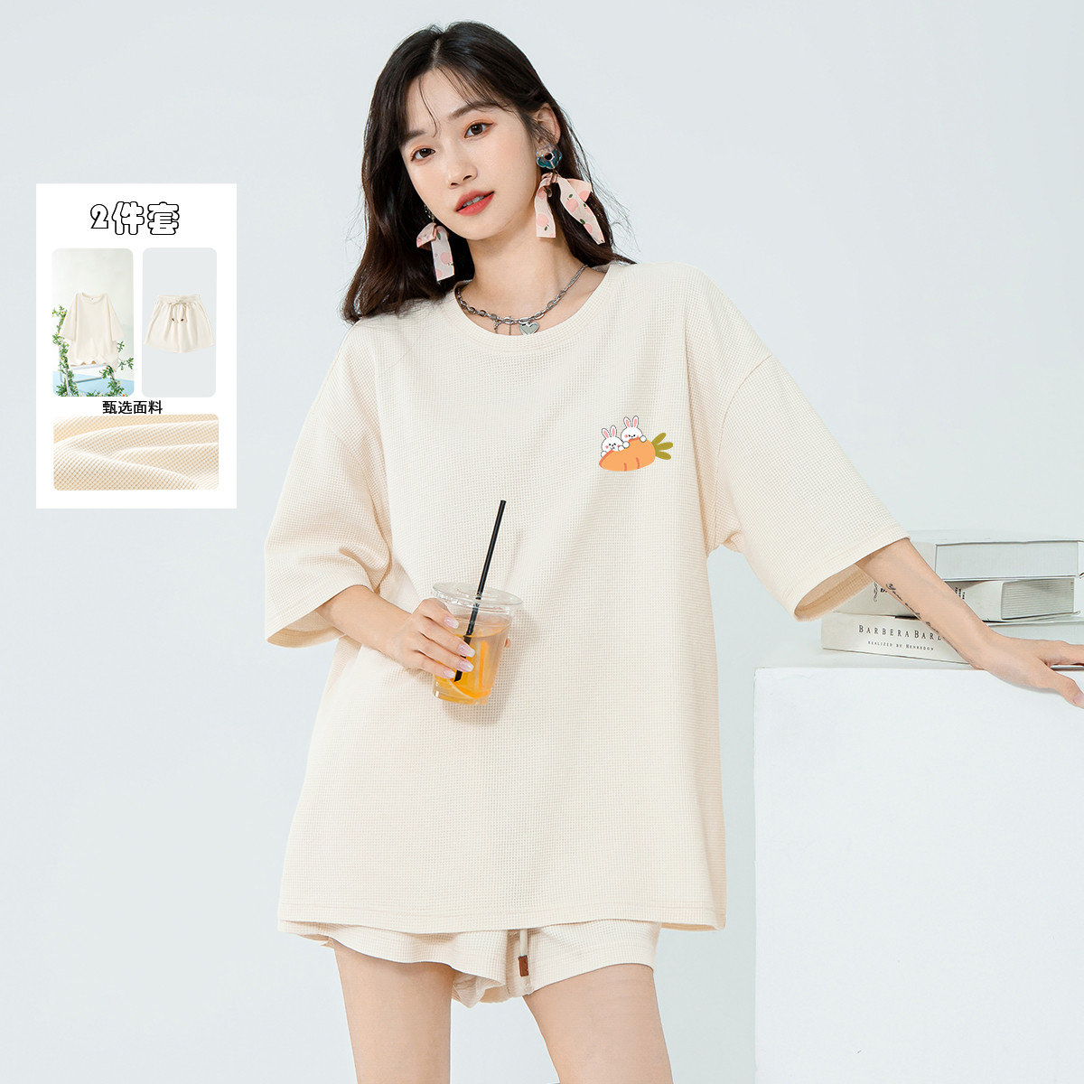 【女装】华夫格运动套装女夏季宽松重磅中长T+三分短裤 833491