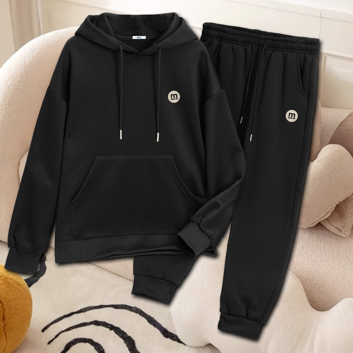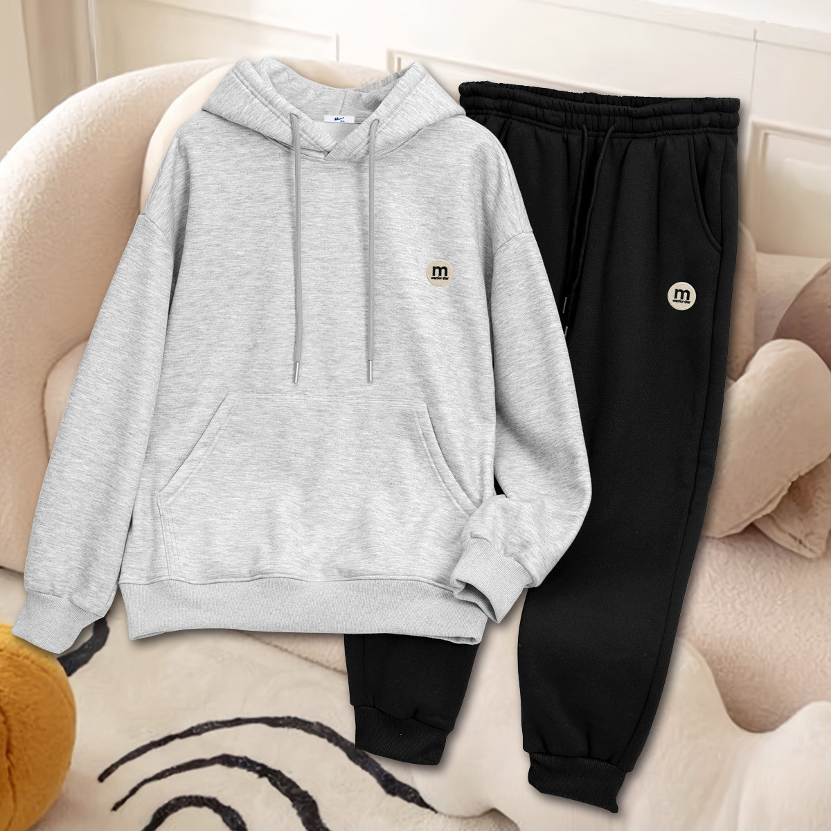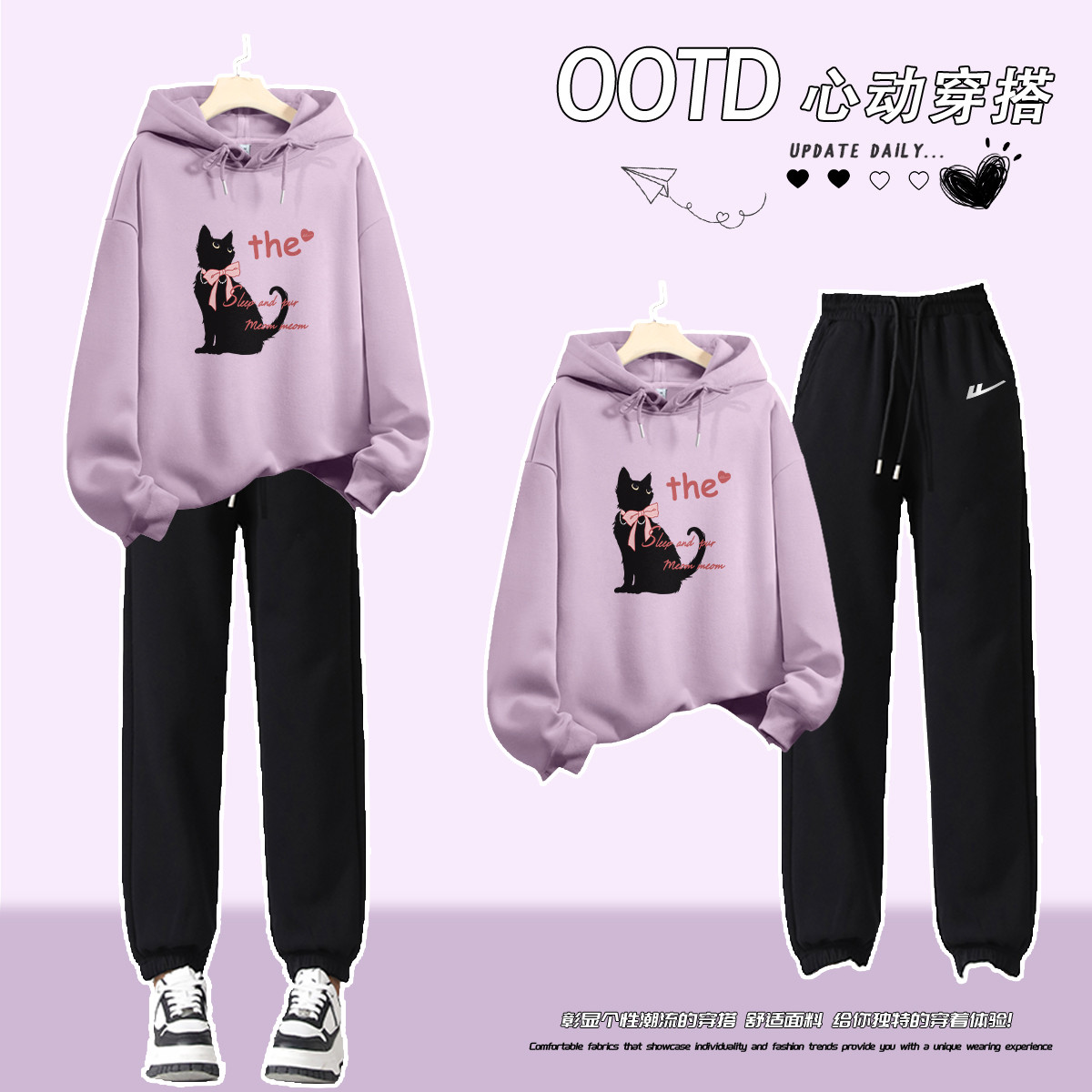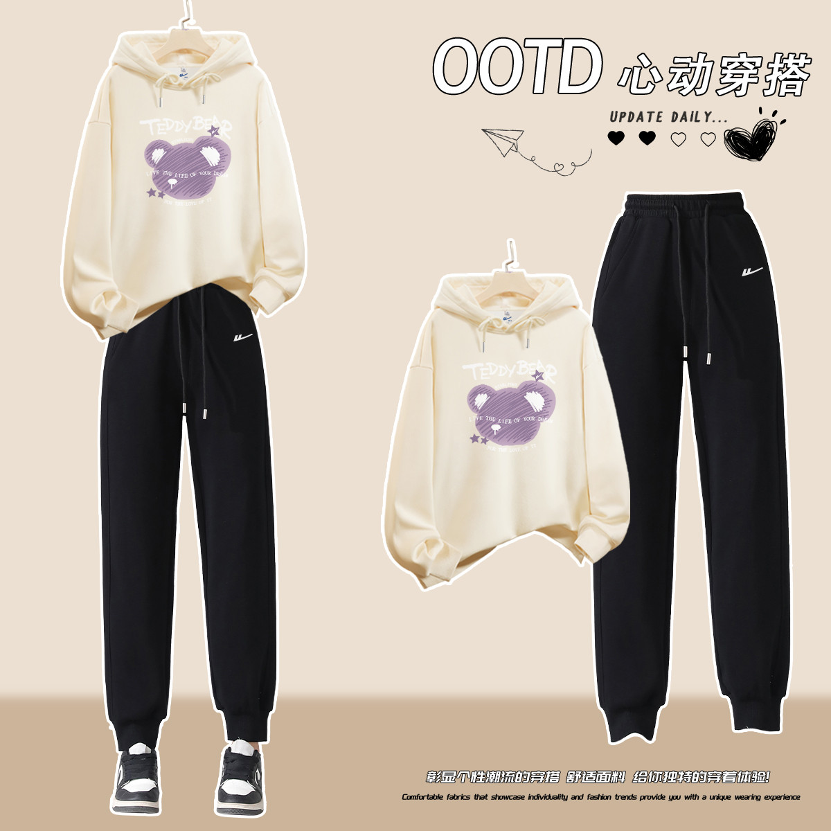 【女装2件装】春秋运动套装女宽松连帽卫衣+休闲螺纹收脚裤 611411