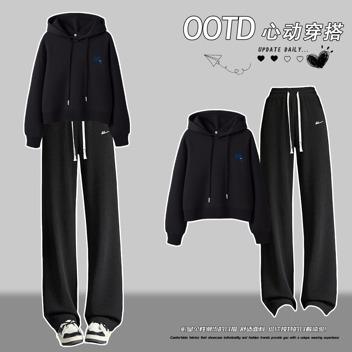 【女装2件装】春秋运动套装女短款连帽卫衣+休闲直筒收脚裤 068563