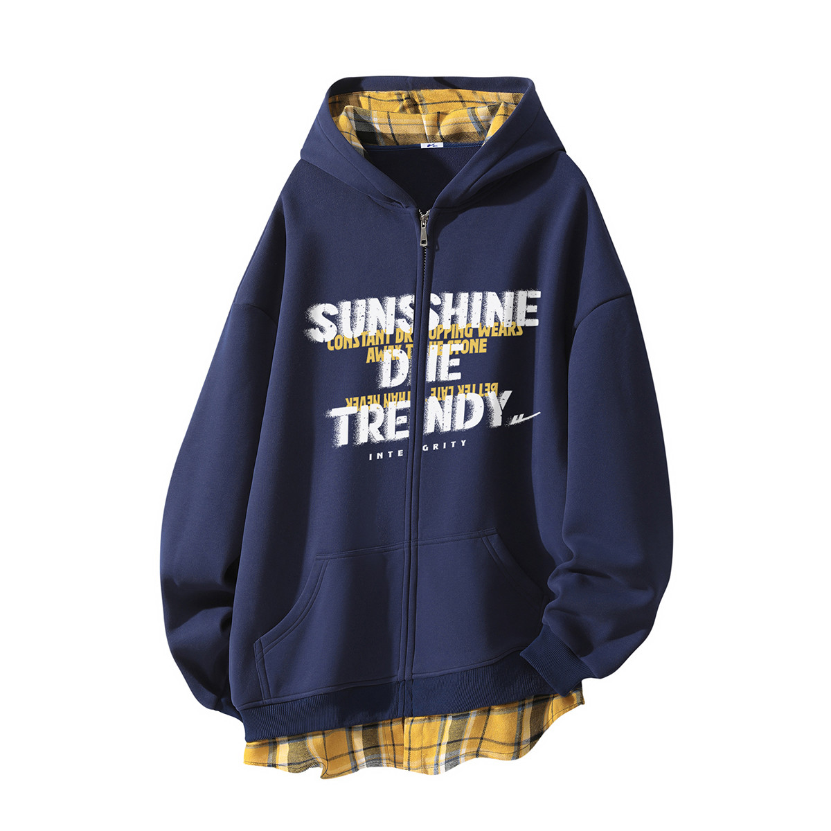 美式复古假两件拼接格子连帽卫衣宽松慵懒风拉链开衫情侣款外套 593683