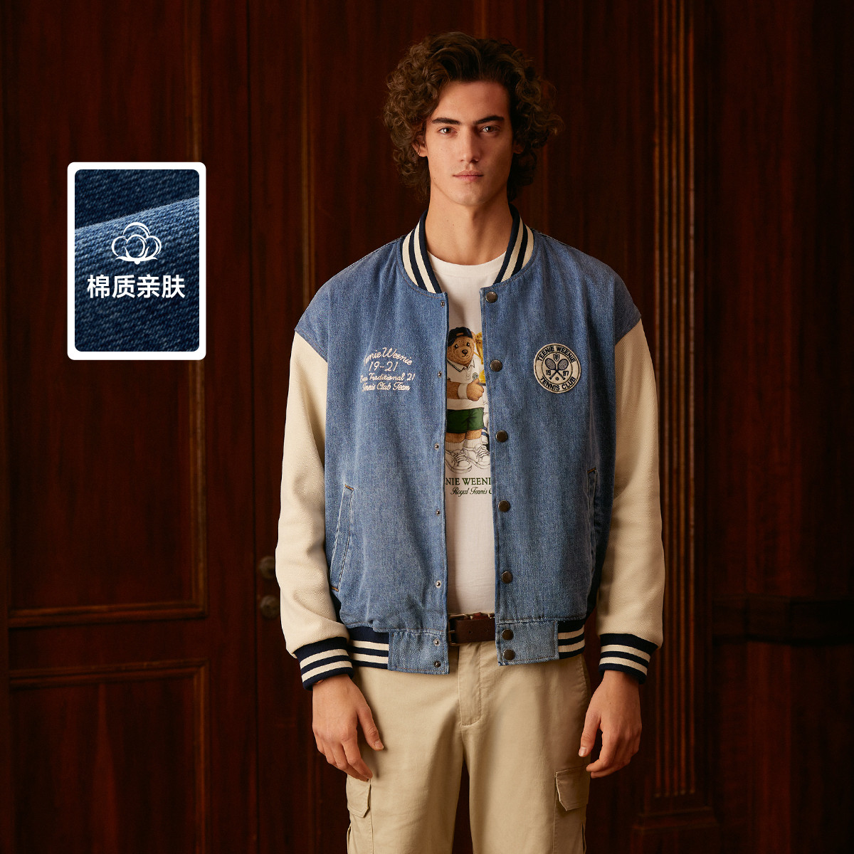 小熊男装简约时尚潮流休闲夹克秋装美式棒球服拼接外套潮牌男 972865
