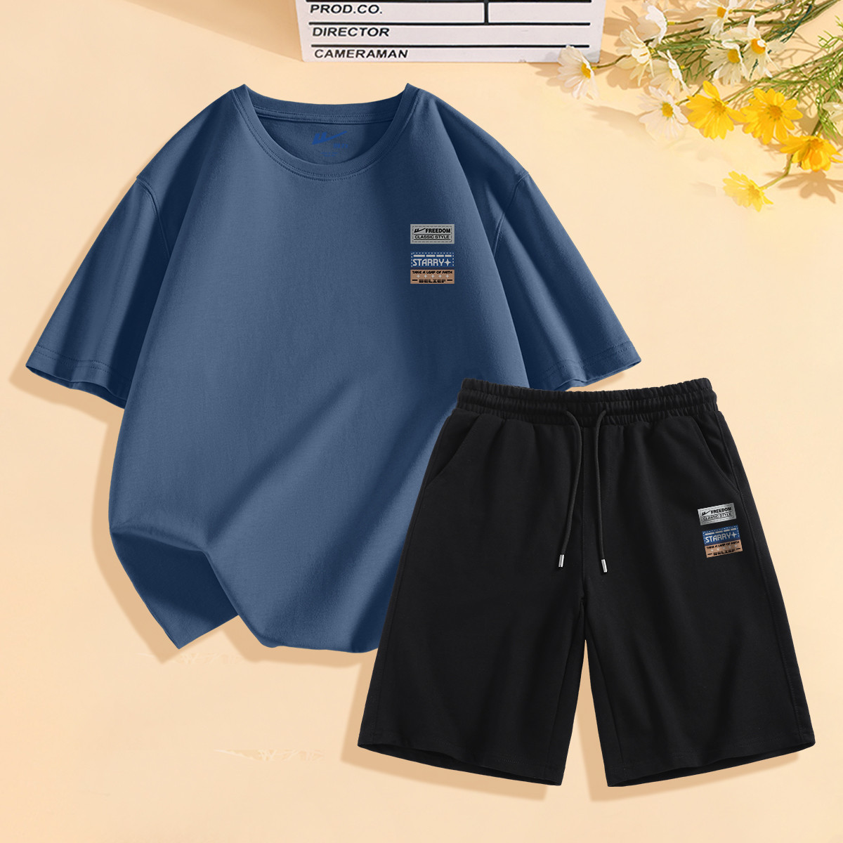 【100%棉】夏季重磅纯棉跑步篮球健身休闲短袖短裤运动套装男 081363