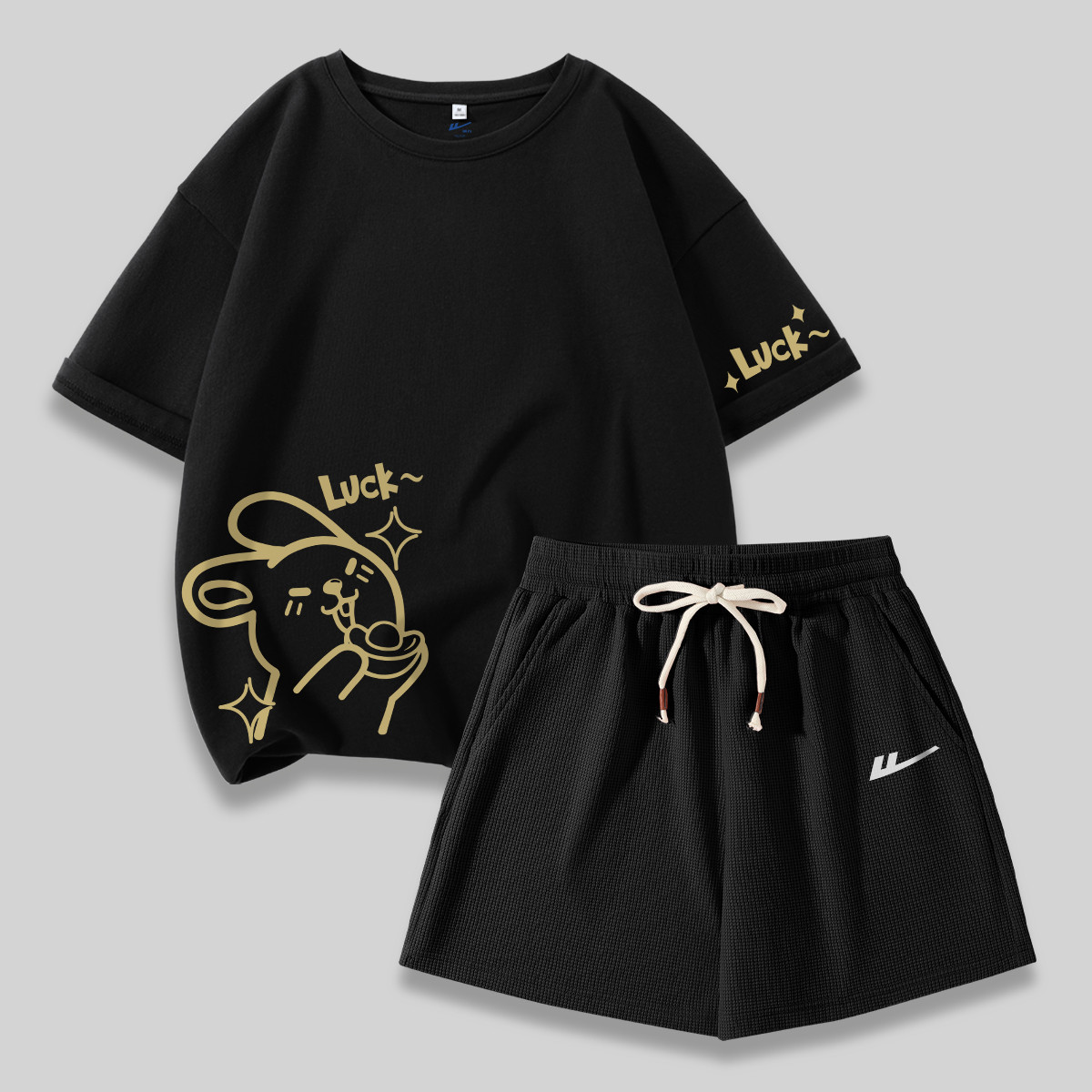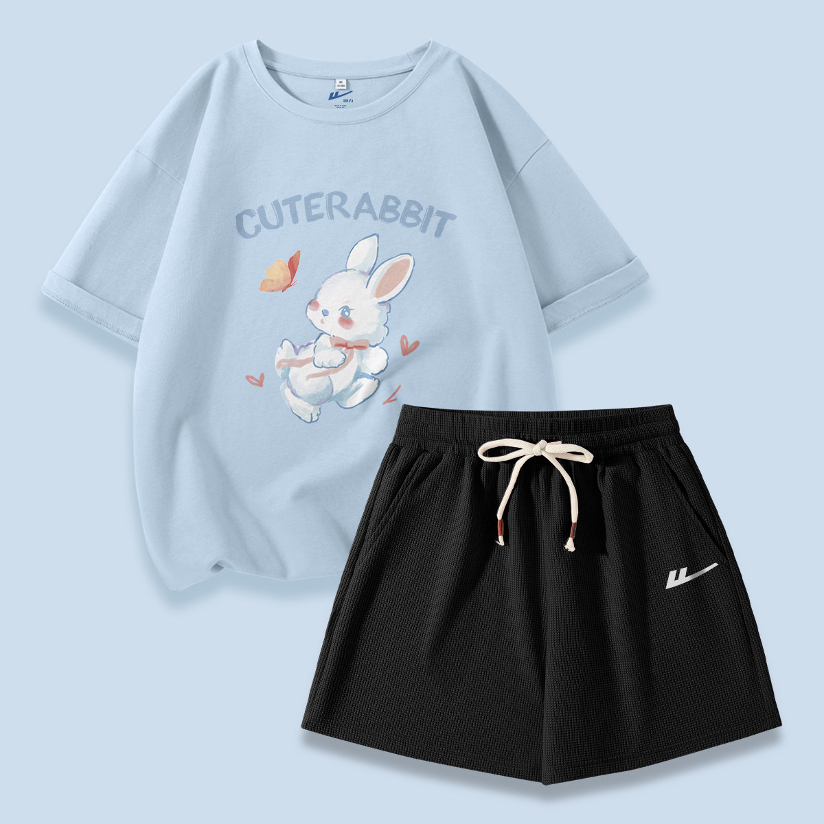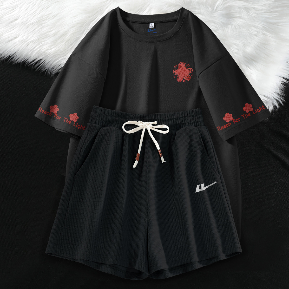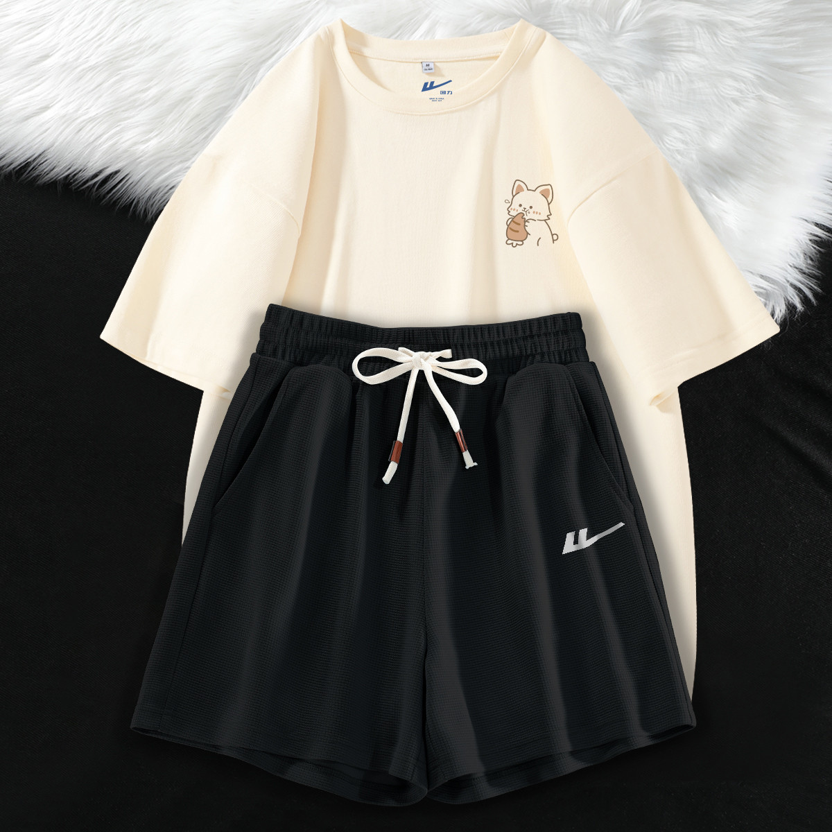 【女装】夏季女式运动套装华夫格三分短裤+宽松T两件套 223059