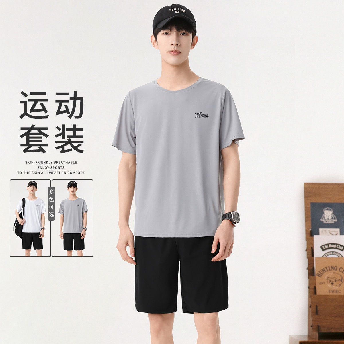 【凉感两件套】夏季男士套装高弹薄款休闲短T跑步冰丝运动套装男 264147