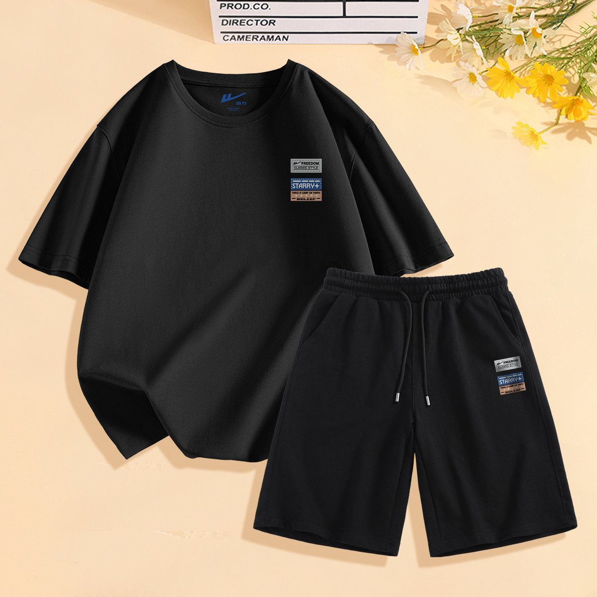 【100%棉】夏季重磅纯棉跑步篮球健身休闲短袖短裤运动套装男 376275