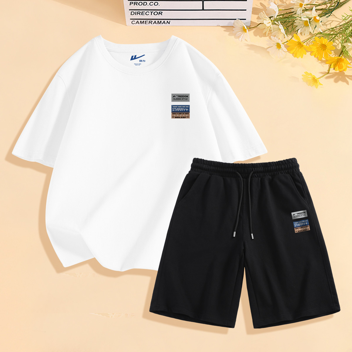 【100%棉】夏季重磅纯棉跑步篮球健身休闲短袖短裤运动套装男 163283