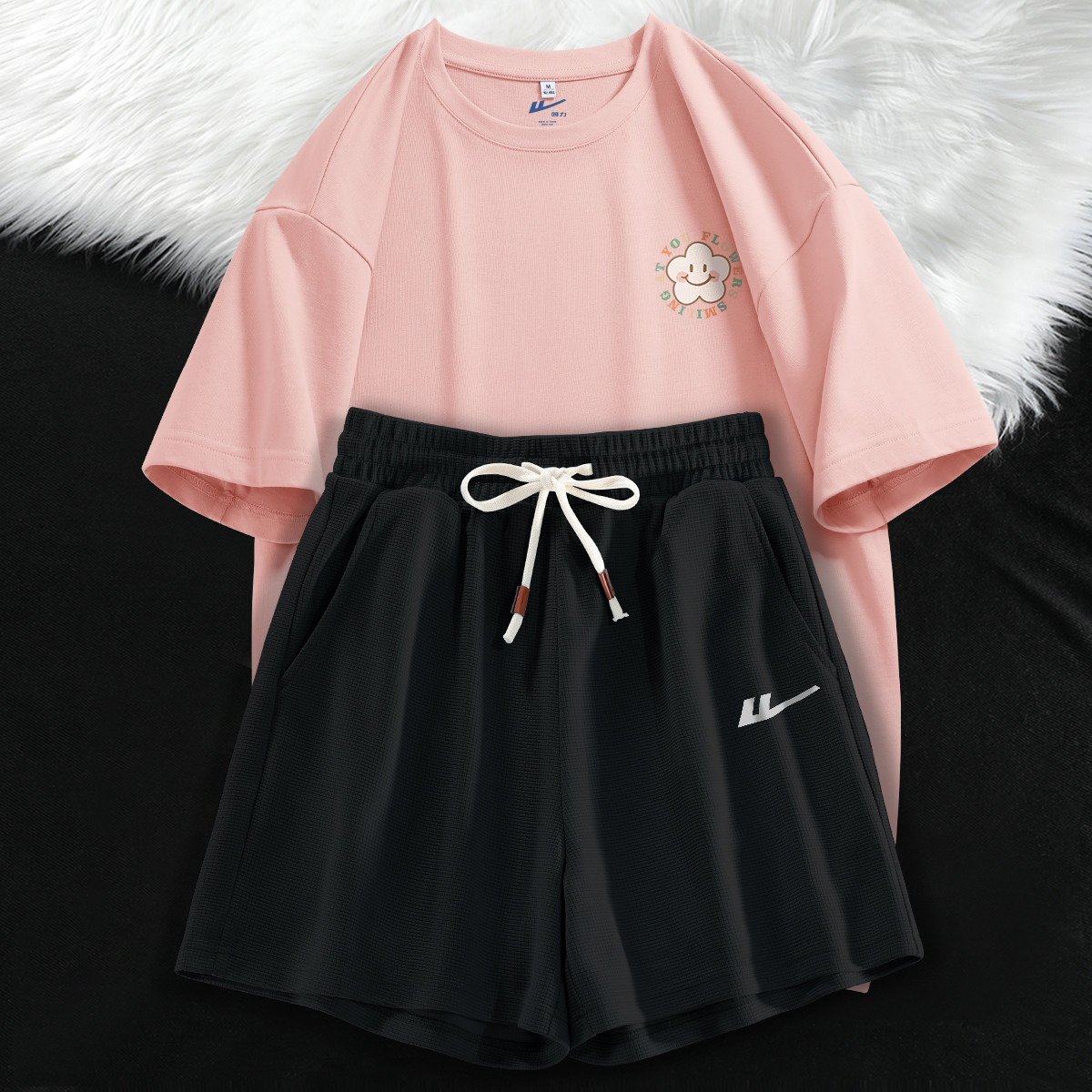 【女装】夏季女式运动套装华夫格三分短裤+宽松T两件套 864211