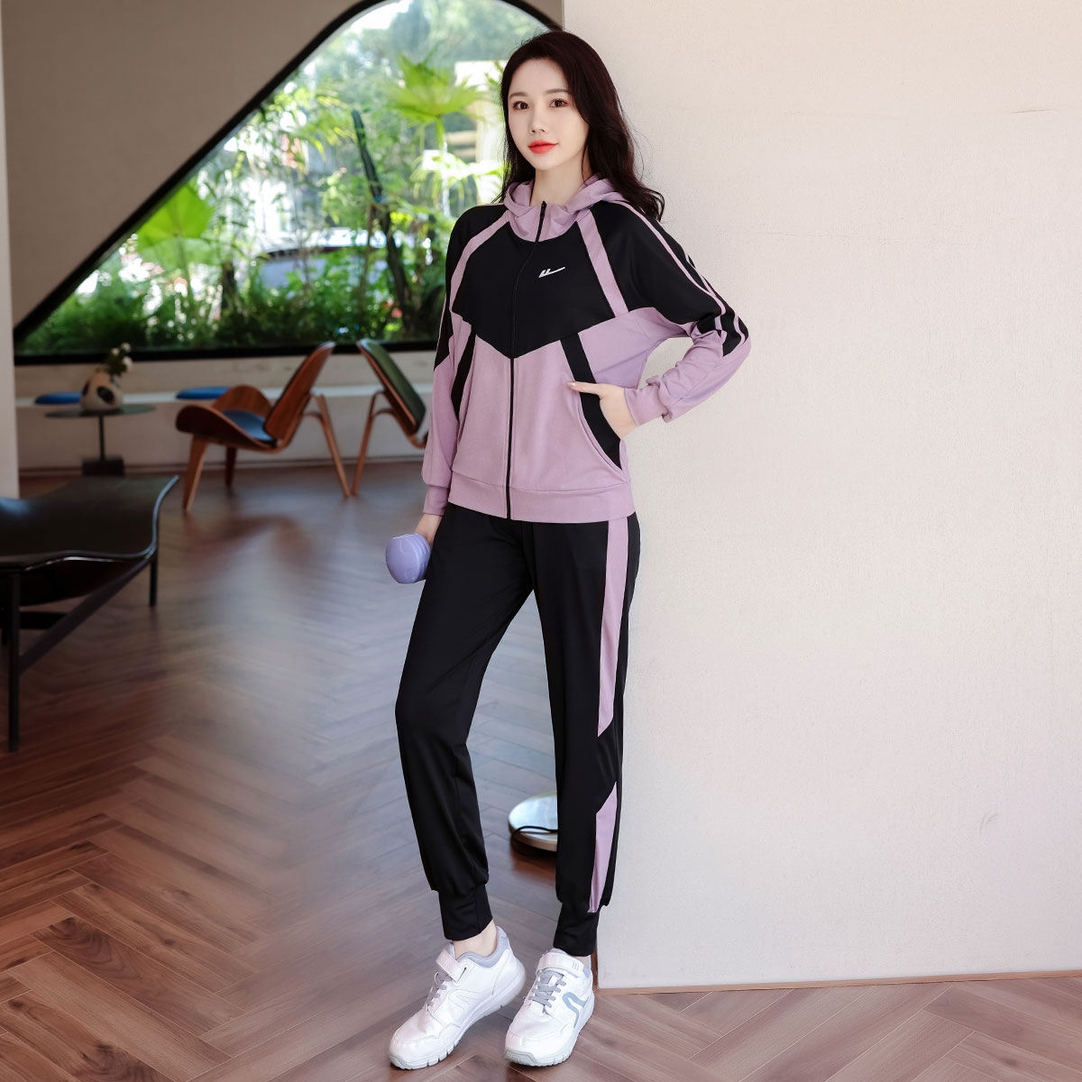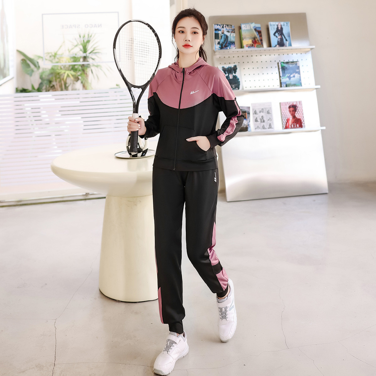 运动服套装女时尚显瘦连帽拼接长袖长裤休闲运动跑步套装两件套女 091219