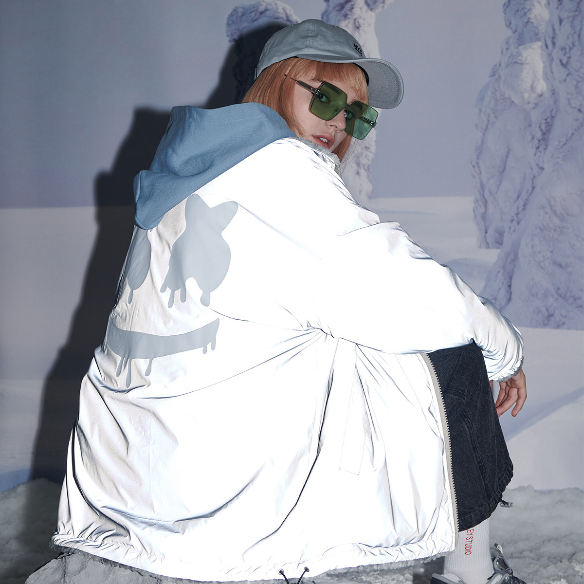 两面穿反光外套男女同款冬季情侣仿羊羔绒美式格子双面上衣 402647