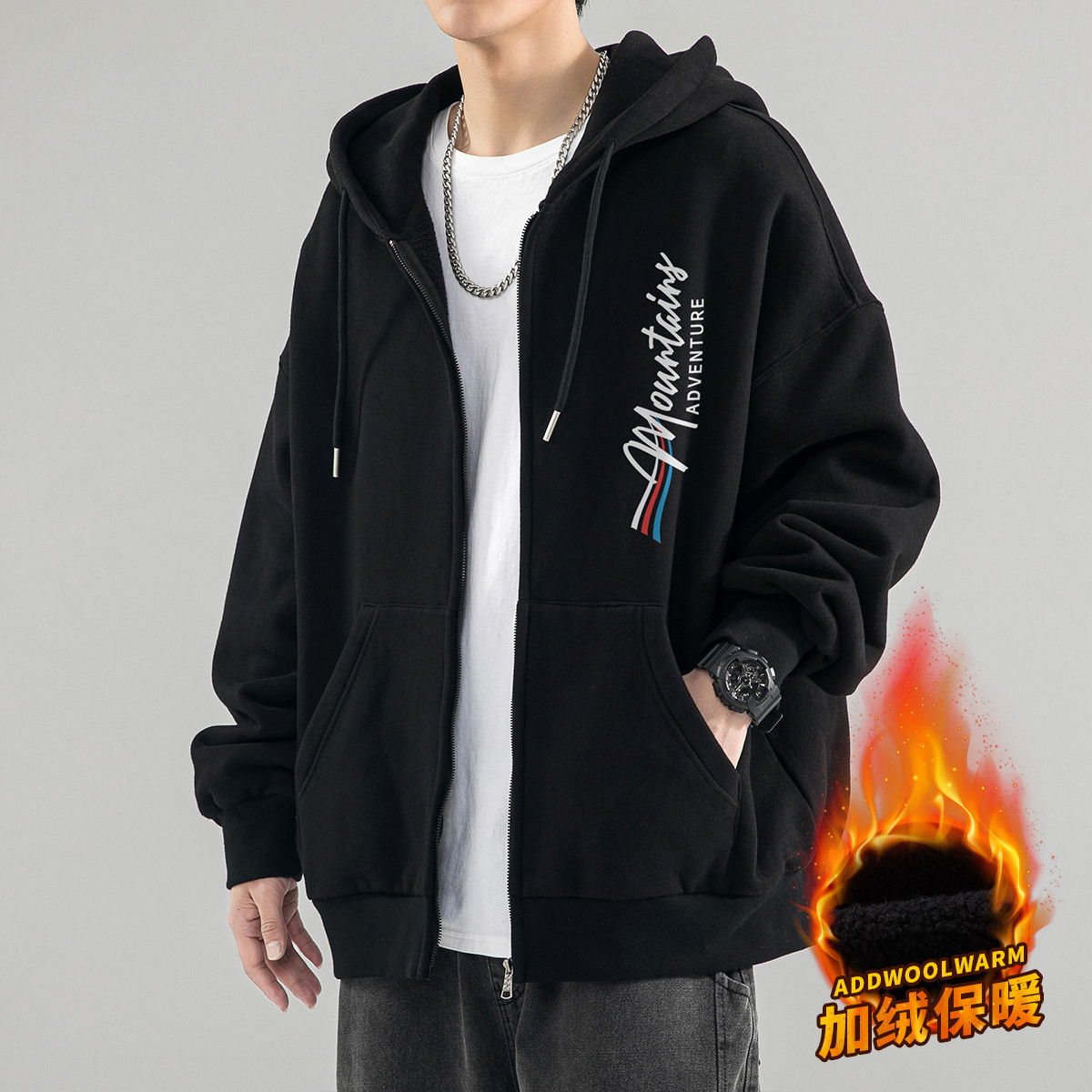 【加绒可选】美式潮牌外套男士运动连帽开衫卫衣男生上衣服 865875