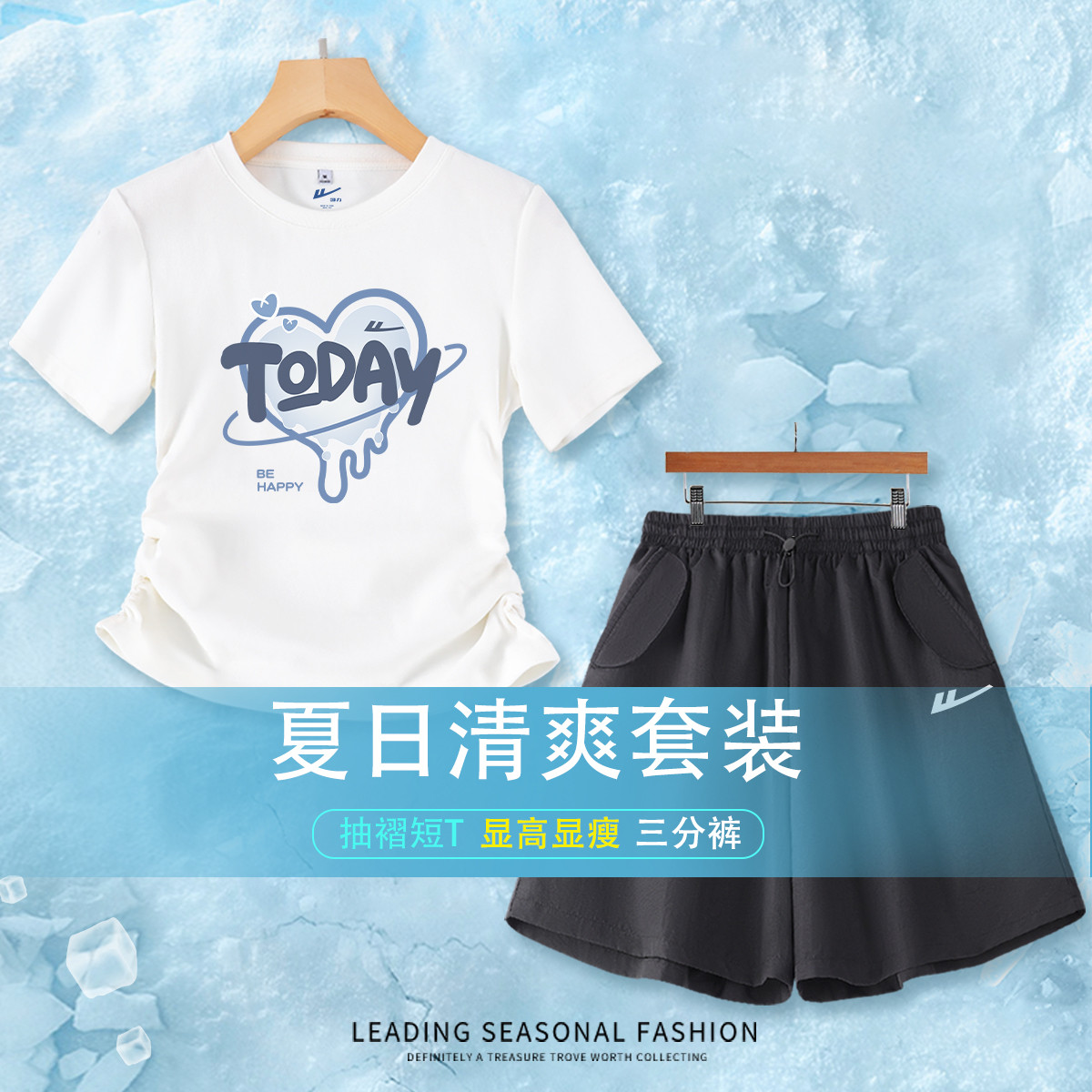 【女装】夏季运动套装女抽褶短款T恤+工装三分短裤小个子两件套 591507